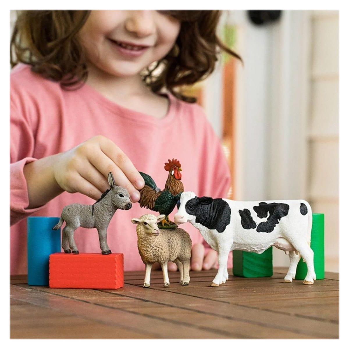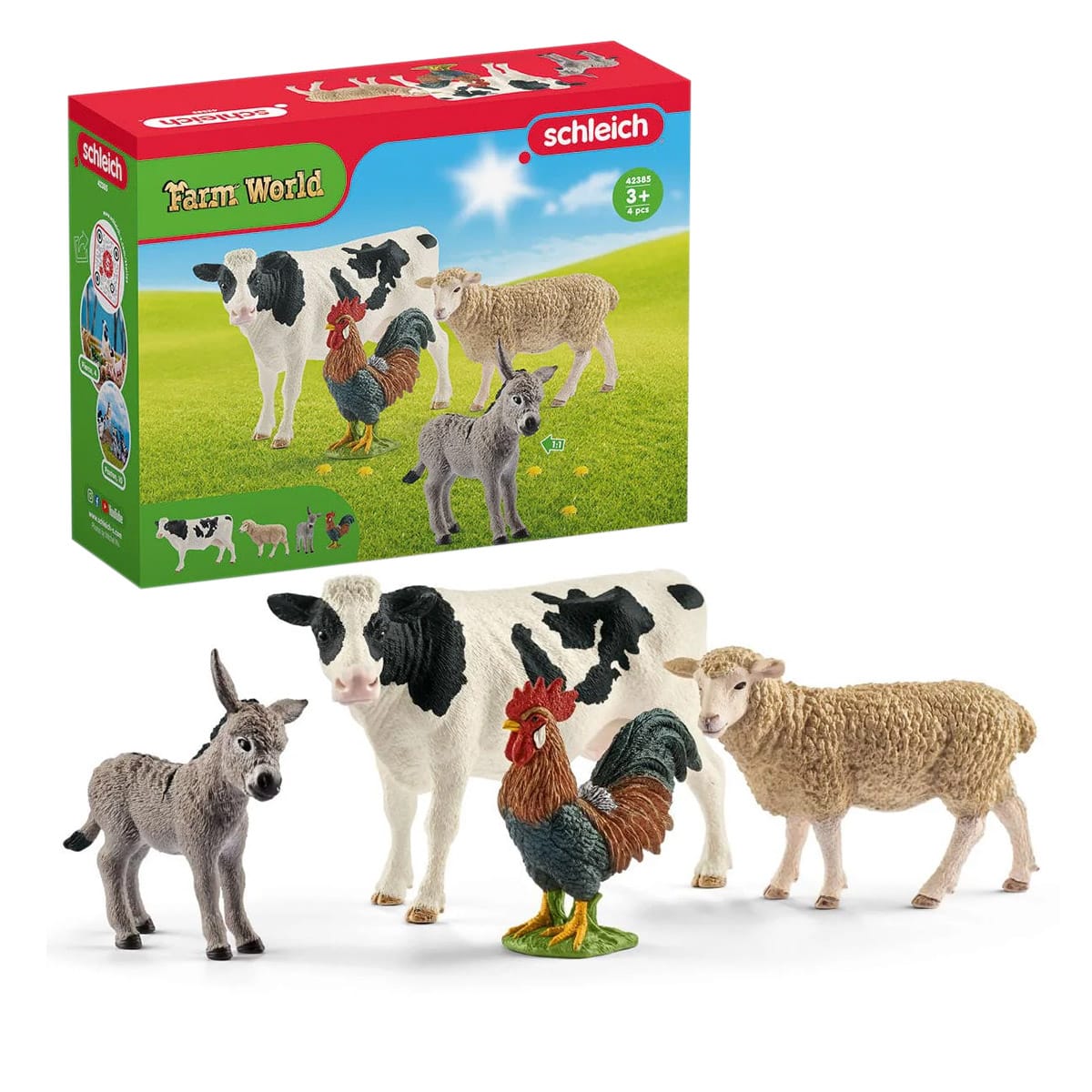 • Acest set de patru figurine de animale de ferma de la Schleich face parte din colectia Farm World – o lume miniaturala de joaca, construita in jurul animalelor realistice si seturilor de joaca care infatiseaza viata la ferma.