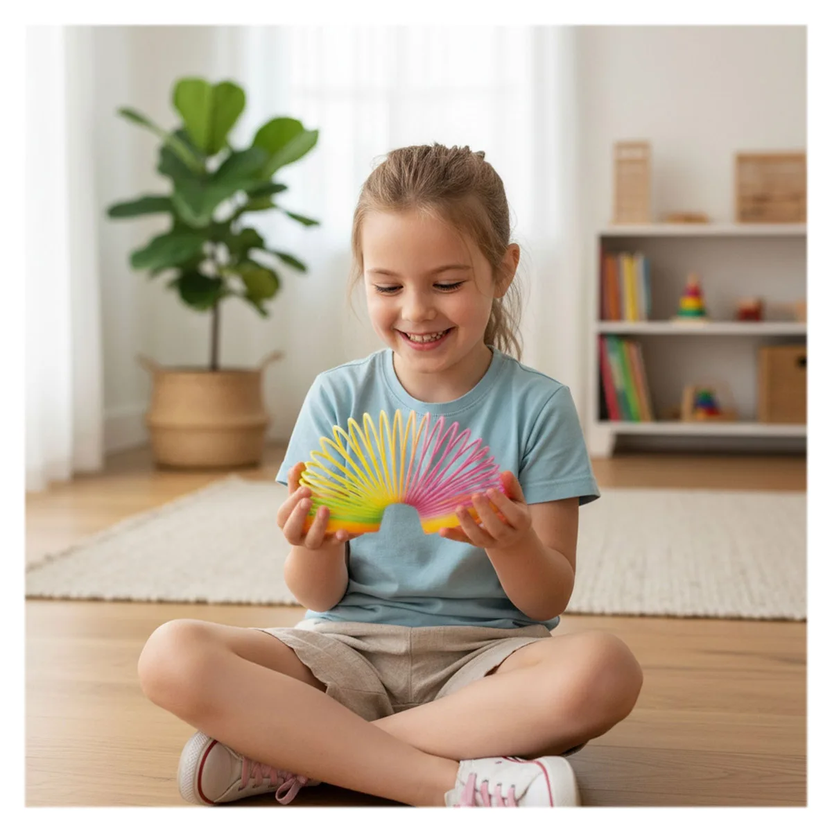 Datorită designului flexibil, spirala se mișcă într-un mod spectaculos atunci când este întinsă sau lăsată să se deplaseze. Este perfectă pentru jocuri creative și pentru explorarea mișcării și gravitației.