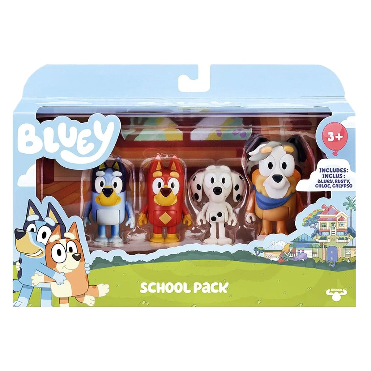 - Setul Blue Friends include 4 figurine: Bluey, colegii ei de la scoala Chloe si Rusty si profesoara lor, Calypso!