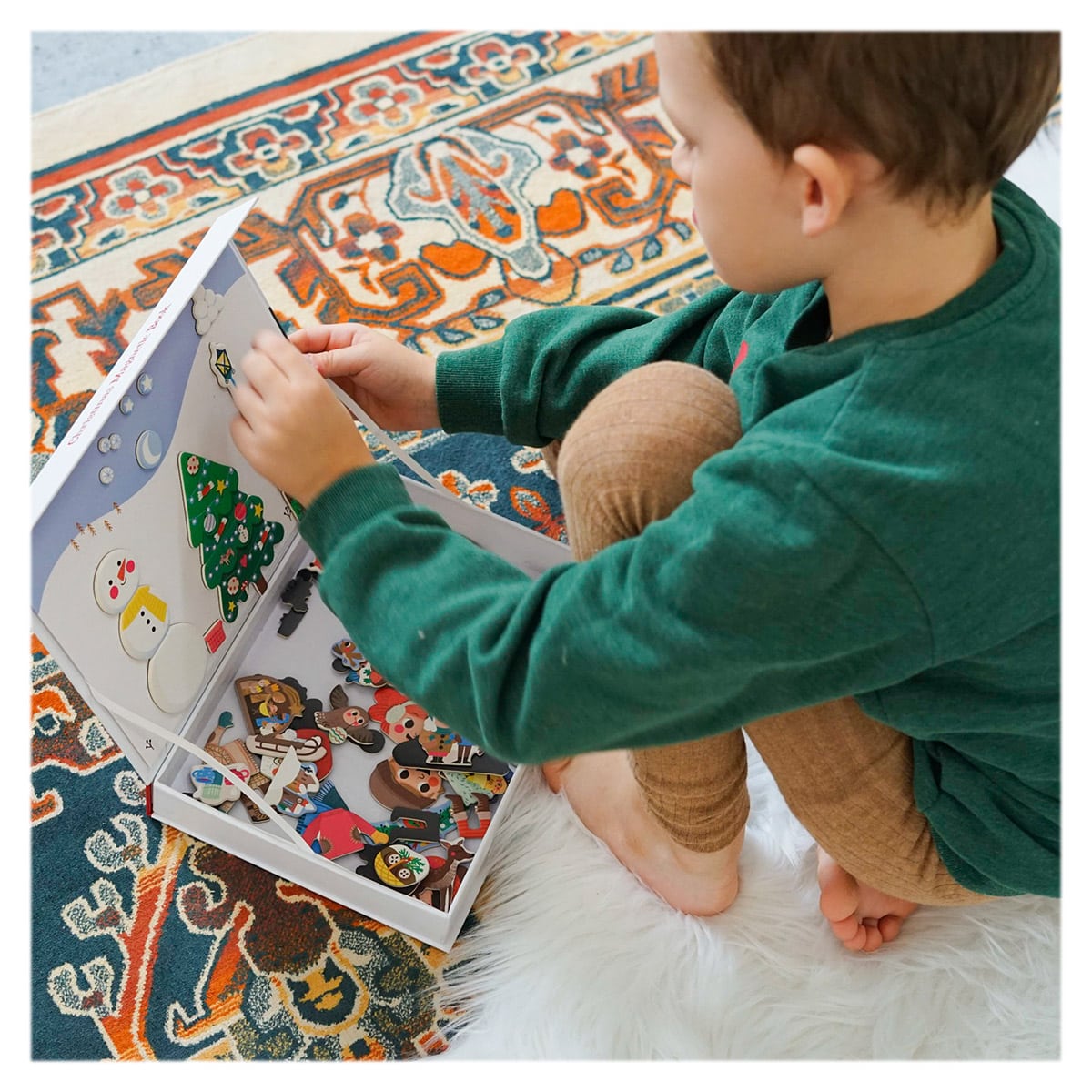 - Cu ajutorul magnetilor frumos ilustrati de artista slovaca Edita Hajdu, cei mici pot combina elemente precum bradul de Craciun, globurile, cadourile, sania, animalutele simpatice sau personajele vesele din familie, pentru a crea scene pline de farmec.