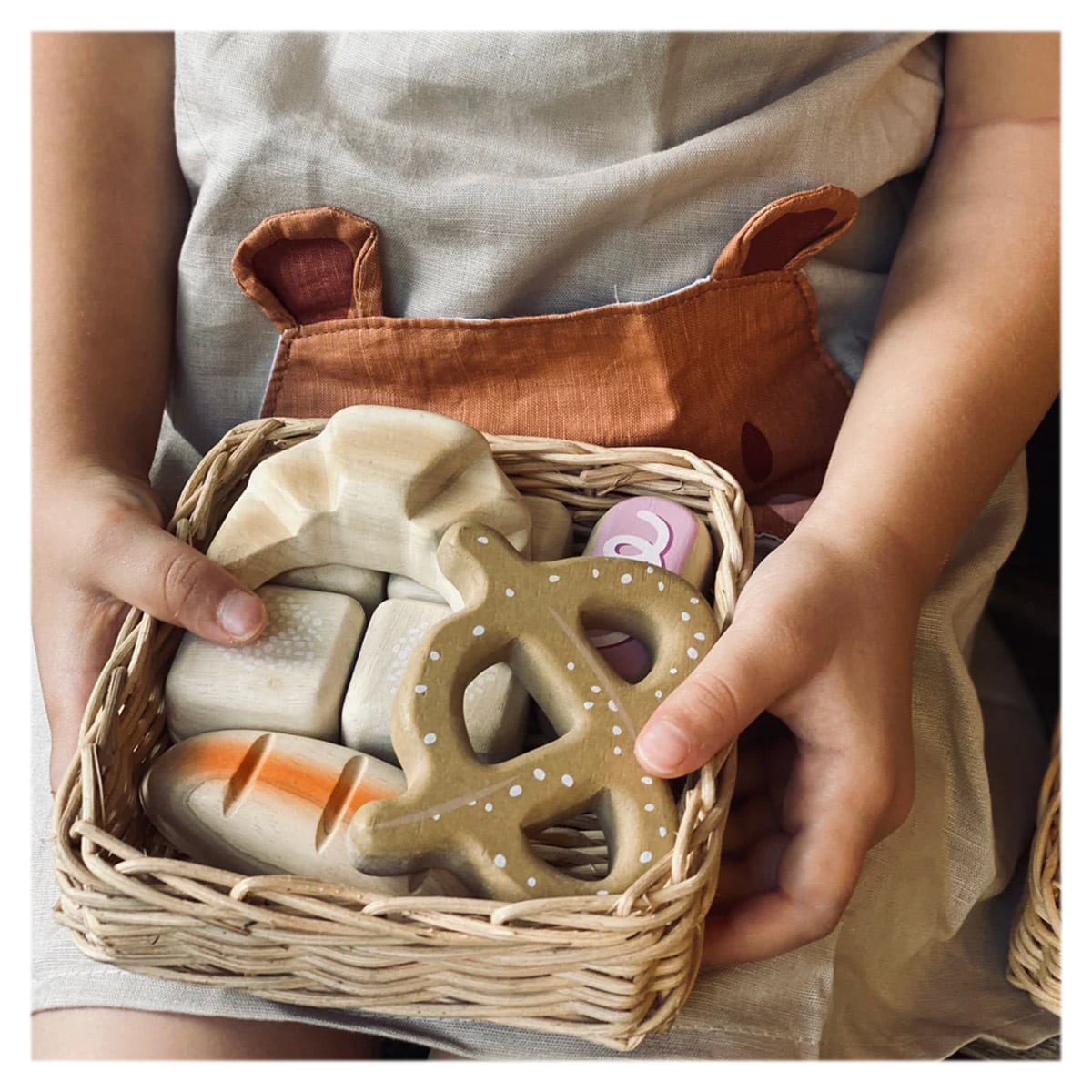 - Acest set elegant include un cosulet lucrat manual, din nuiele impletite, plin cu „produse de brutarie” realizate din lemn: croissant, o chifla glazurata, un covrig, o bagheta si 4 chifle detasabile, prinse cu velcro, care se pot desprinde pentru a putea fi impartite.