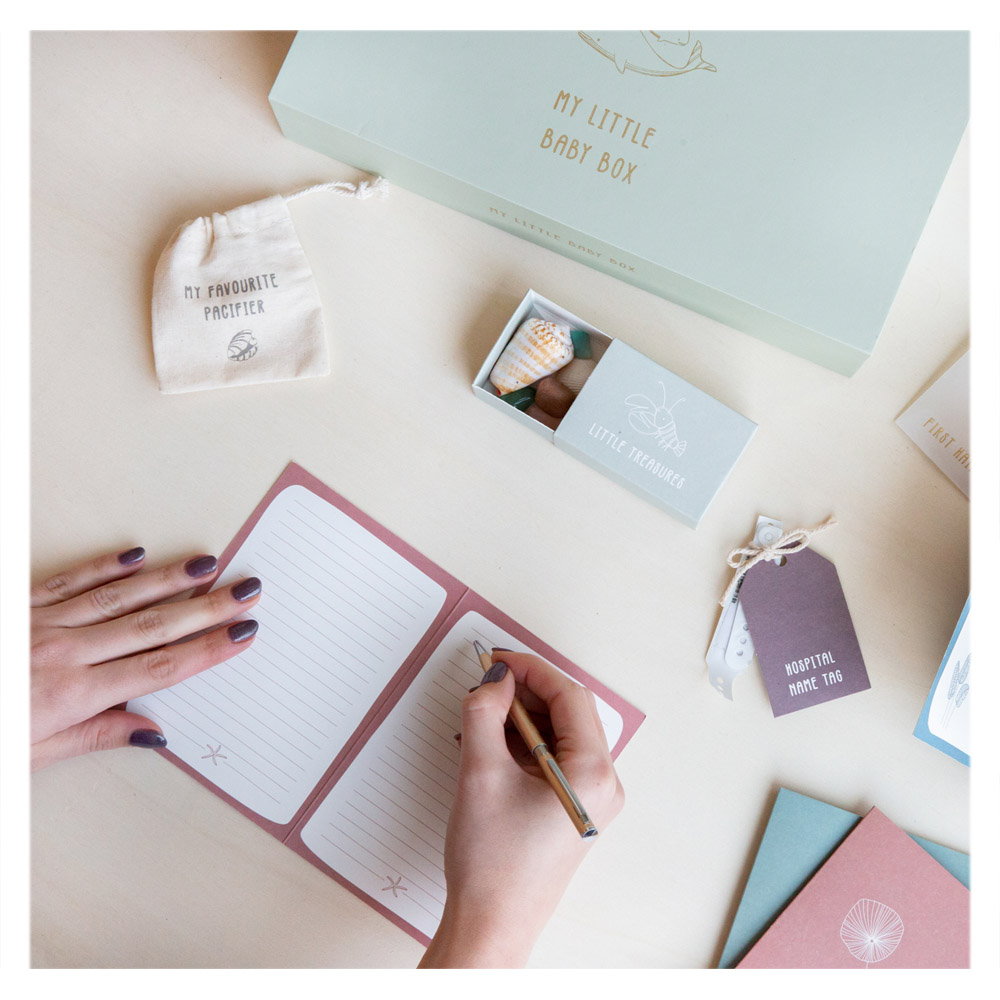 - Cutia contine: un plic pentru prima suvita de par, un saculet din bumbac pentru prima pereche de pantofiori, un saculet din bumbac pentru suzeta preferata, cutiute pentru pastrat dintisorii de lapte, amintiri, comori si dorinte, un metru din hartie pentru a urmari cresterea copilului, carduri pentru fotografiile ecografiilor, pentru amprentele picioruselor si manutelor, pentru primele cuvinte ale bebelusului si pentru fotografiile/ notele / gandurile pe care doresti sa ti le amintesti, etichete pentru a fi completate cu numele spitalului unde s-a nascut bebelusul, hainutelor sau jucariei preferate, etichete goale pentru a fi atasate obiectelor speciale.