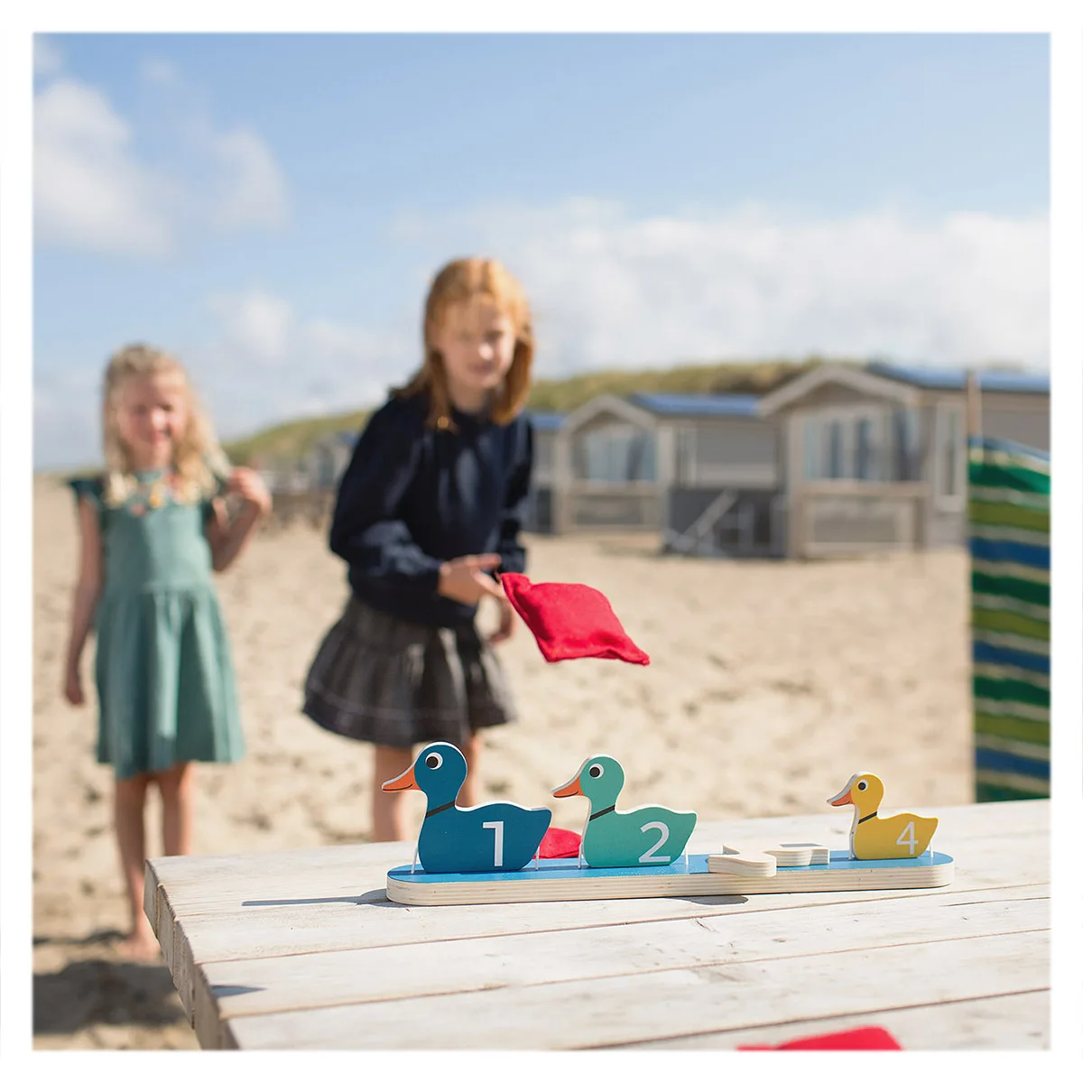 - Jocul include: o baza cu 4 rate din lemn prinse cu elastic (40 x 6 x 10 cm), 3 saculeti umpluti cu nisip (7 x 6 x 2 cm).