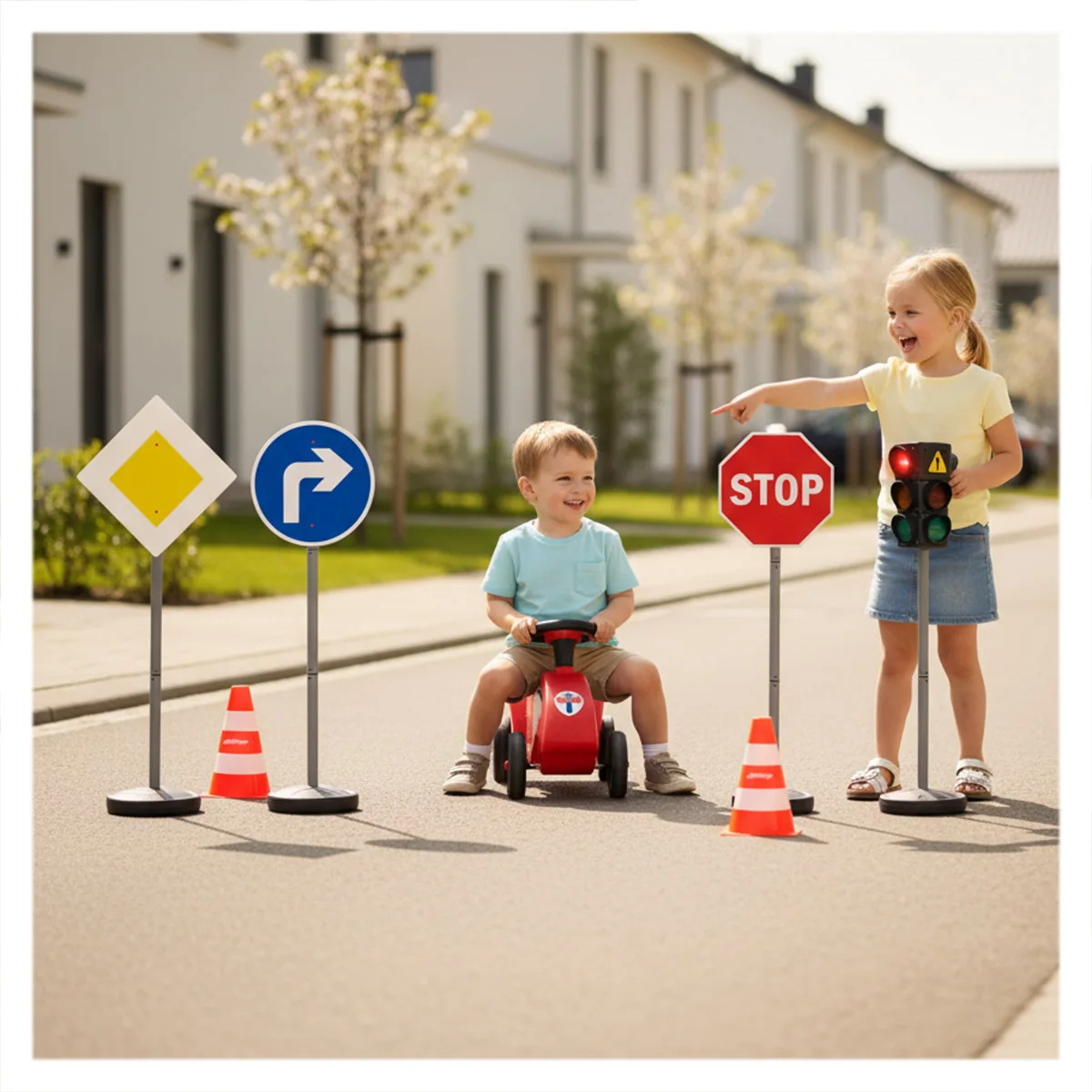 Setul XXL de educație rutieră cu un semafor înalt de 70 cm, 10 indicatoare rutiere realiste înalte de 75 cm și 4 conuri robuste este conceput pentru a-i ajuta pe copii să înțeleagă semnele și regulile de bază ale circulației. Prin jocuri de rol interactive, cei mici învață cum să fie pietoni sau „șoferi” responsabili.