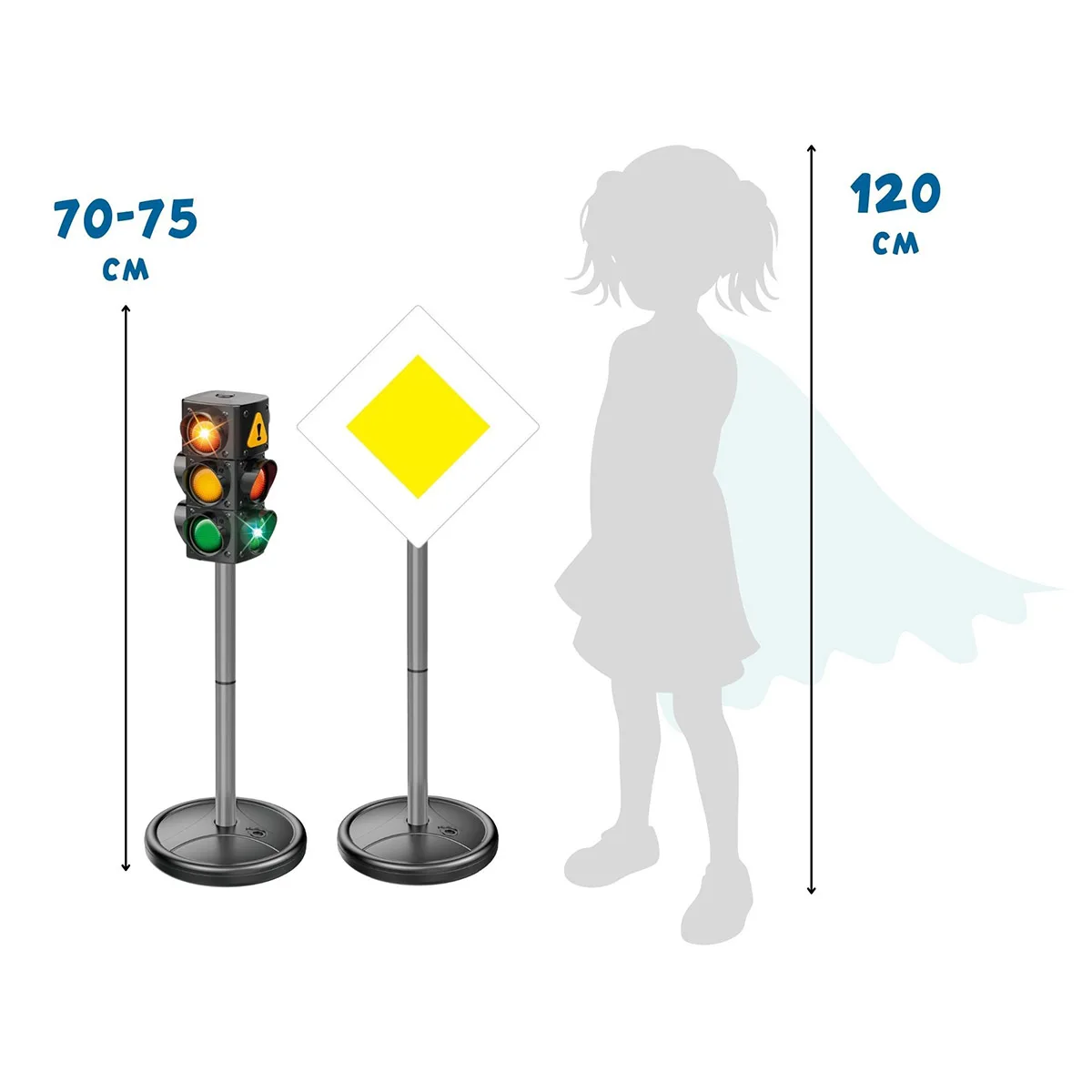 - Conține: semafor cu baterii (70 cm) cu efecte luminoase și sonore, 10 indicatoare rutiere cu 6 suporturi (75 cm) și montare pe ambele părți, 4 conuri de semnalizare (24 cm) pentru un design versatil al traseului