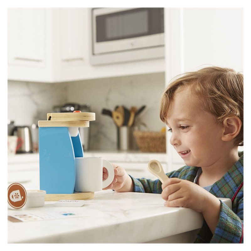 - Setul de joaca realist include 11 piese: 1 espressor, 2 cani din lemn, 3 capsule cu arome de cafea, un cub de gheata, o lingurita, un cub de zahar, un cub de lapte, un meniu.