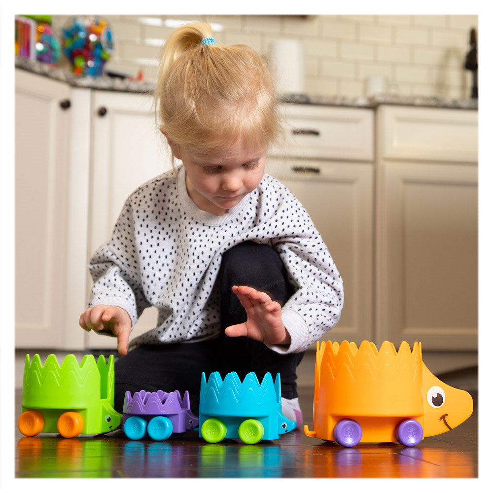 - Setul cuprinde 4 cupe colorate sub forma de arici, prevazute cu roti, care pot fi stivuite si cuibarite una intr-alta sau conectate intr-un trenulet vesel.