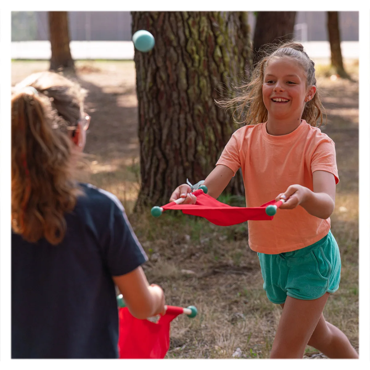 Aruncă mingea în aer și vezi cât timp puteți menține jocul în mișcare! Fiecare jucător ține o paletă textilă și întinde banda de material pentru a propulsa mingea spre celălalt. Jocul poate începe la distanțe mai scurte pentru începători și poate fi extins pe măsură ce îndemânarea crește.