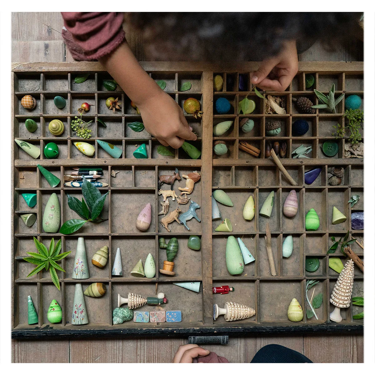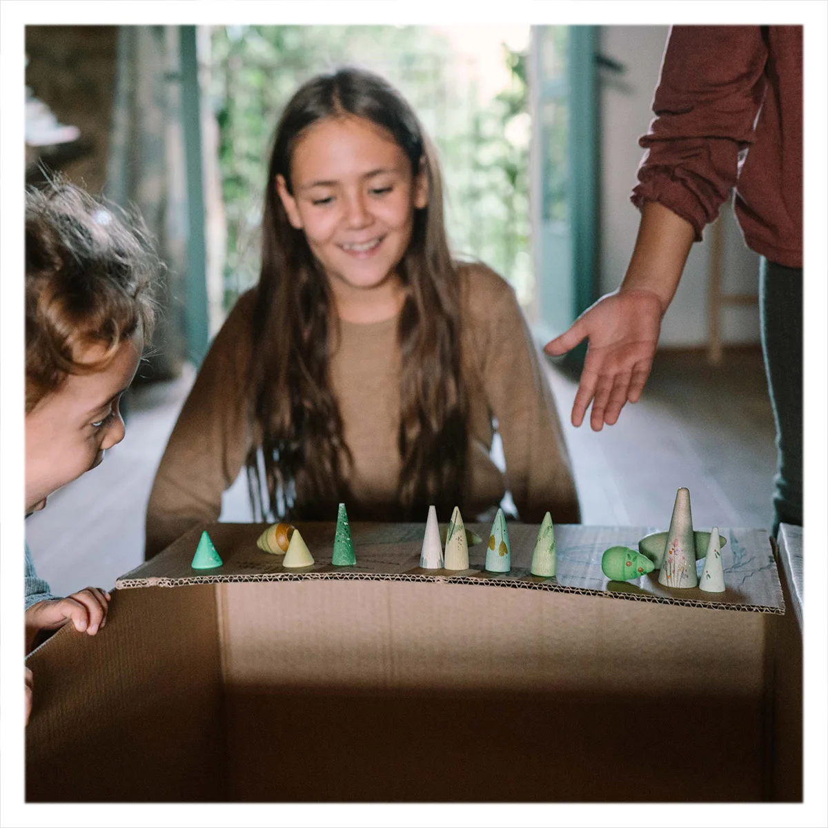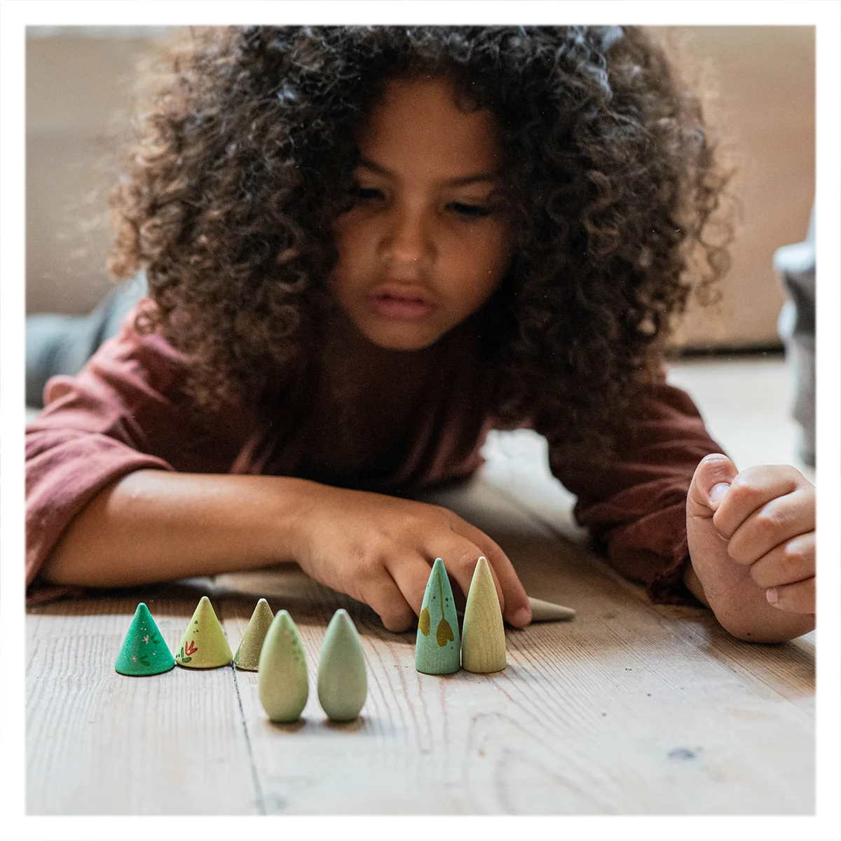 O pădure în mâinile tale — acest set de copaci din lemn pictați manual este conceput pentru joacă liberă, cu forme blânde și tonuri inspirate de natură, care îi invită pe cei mici să construiască, să aranjeze și să exploreze liber. Fie că pregătesc scena pentru prietenii lor – micile animaluțe de jucărie sau creează propriile povești, copiii se bucură de un joc autentic și creativ.