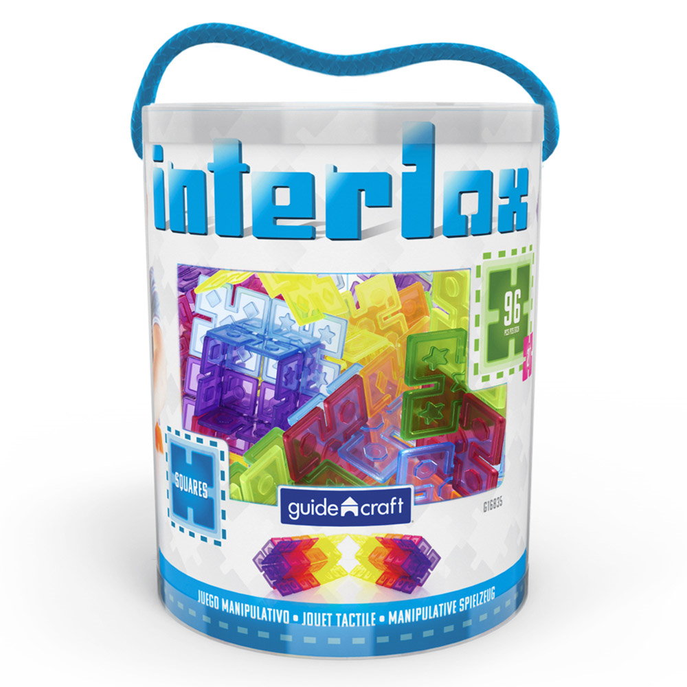- Setul de piese de constructie „open-ended play” Intelox de la Guidecraft include 96 de patrate in sase culori vibrante, translucide, cu muchii crestate care se interconecteaza cu usurinta in siguranta.