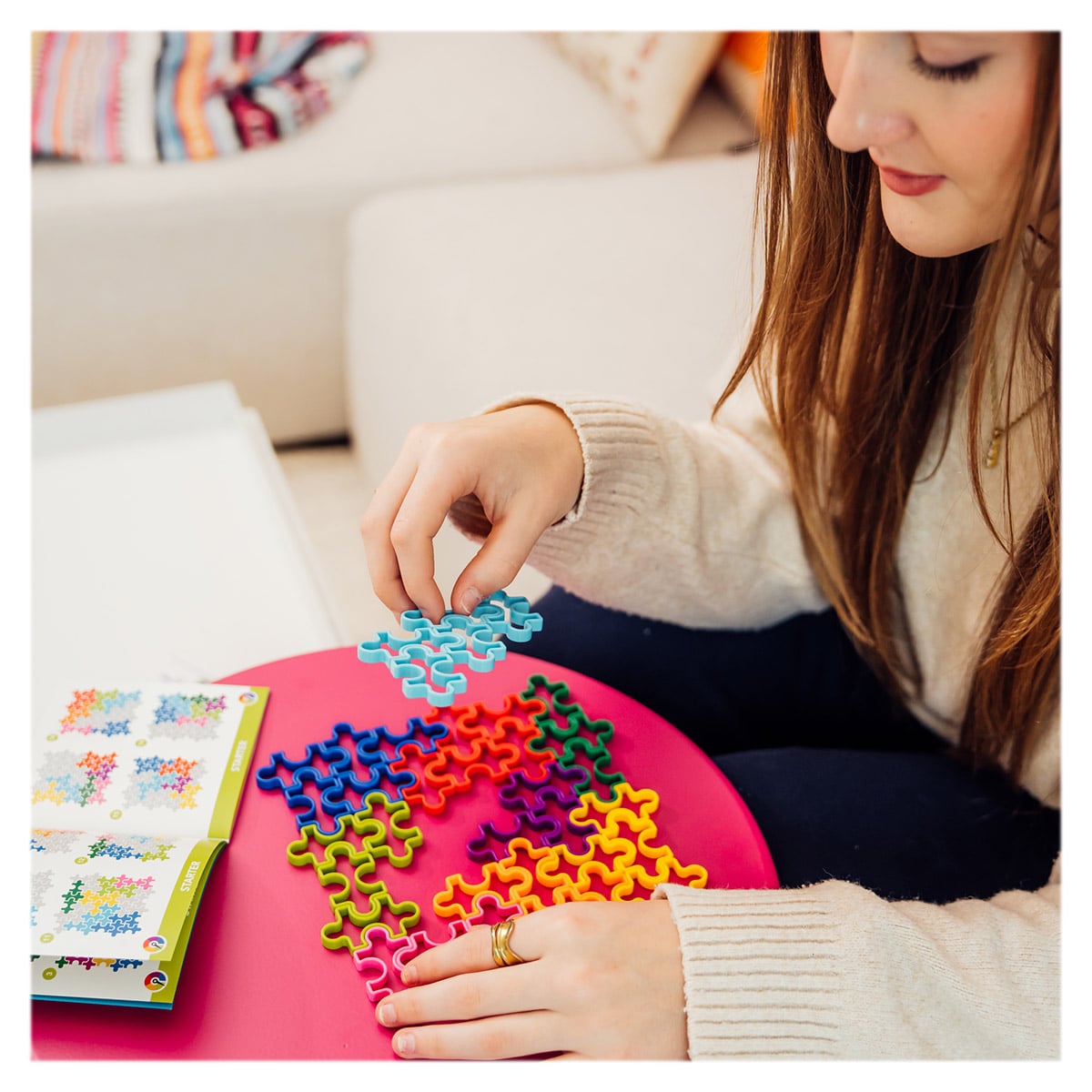 - Jocul contine: 9 piese colorate de puzzle, 1 brosura cu 120 de provocari si solutii.