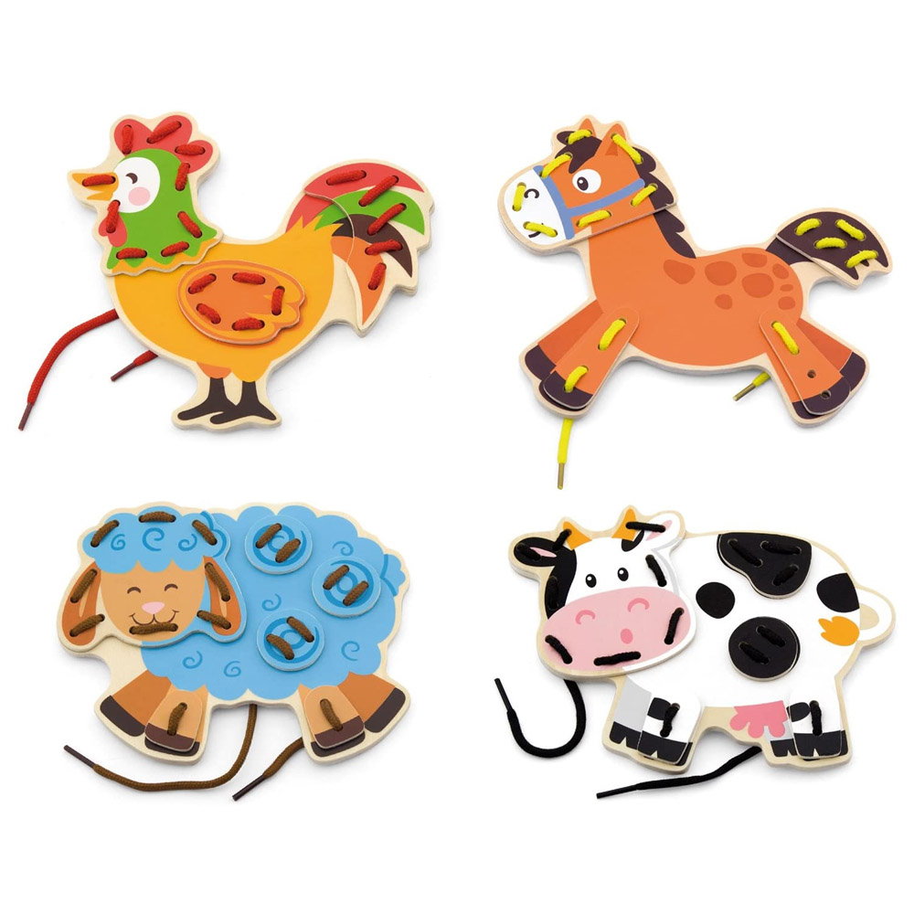 - Setul contine patru sabloane din lemn in forma de animale de ferma (cocos, cal, vaca, oaie), 4 sireturi colorate si parti ale corpului detasabile (picioare, cozi, capete).