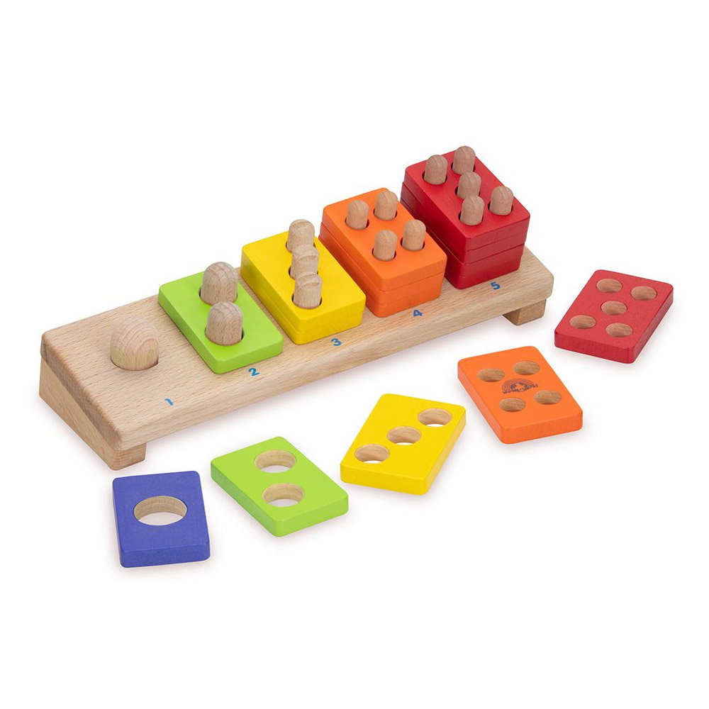 - Aceasta jucarie educativa, realizata din lemn de inalta calitate, este alcatuita dintr-o baza de sortare dreptunghiulara prevazuta cu tije verticale, pe care se vor stivui cele 15 piese colorate.