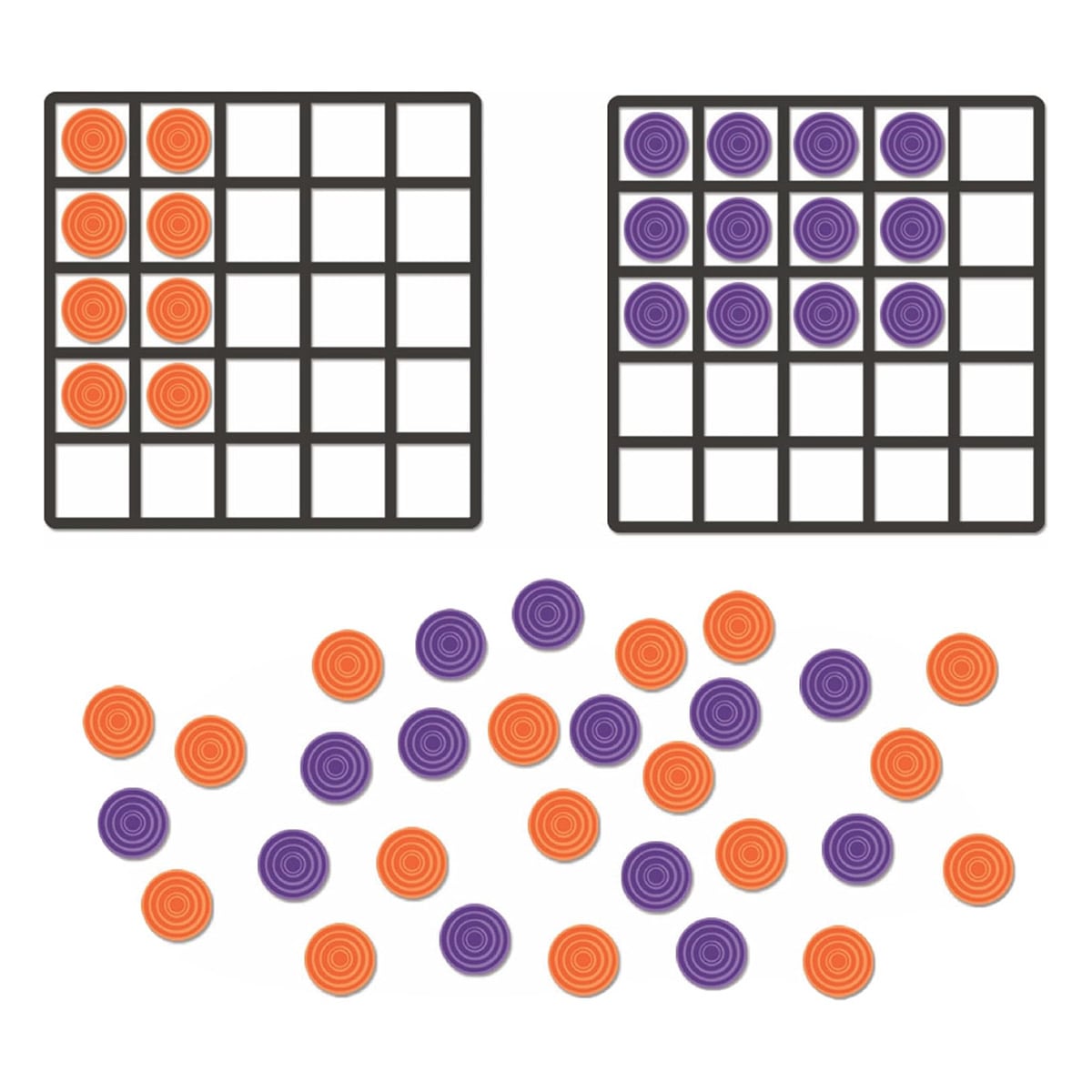 - Setul include: doua placi magnetice 5×5, fiecare cu dimensiunea de 24 x 24 cm, 50 de discuri magnetice colorate, un ghid de activitati in limba engleza.