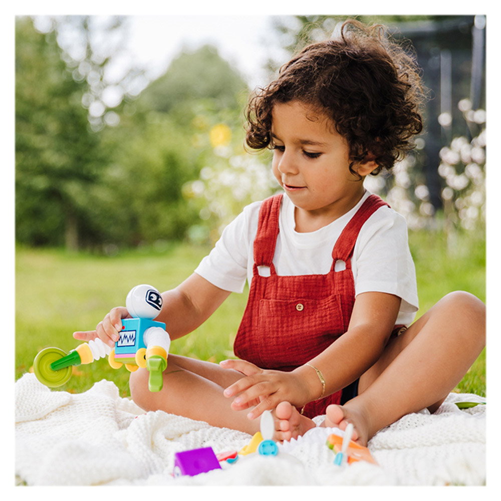 - Piesele setului ofera o multitudine de posibilitati de asamblare si constructie, bazate pe invatarea STEM. Micutii pot reproduce exemplele de pe posterul inclus, sau pot combina pur si simplu piesele magnetice pentru a-si crea proprii robotei haiosi.