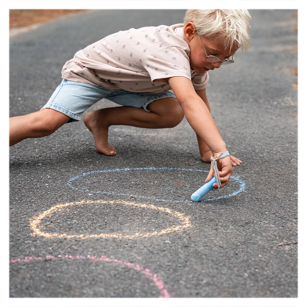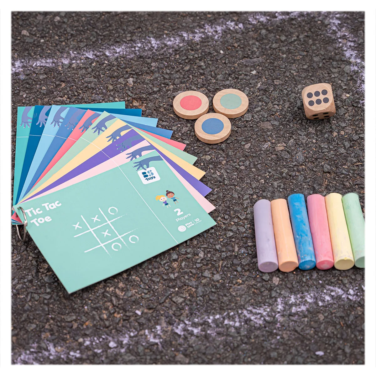 Ești gata pentru distracție în aer liber? Acest set complet include creta pentru trotuar, zar, jetoane de aruncat si 10 carduri pline de idei jucause! Deseneaza-ti terenul de joaca cu creta si descopera activitati precum sotron, darts, ludo, sarituri in lungime si dans!
