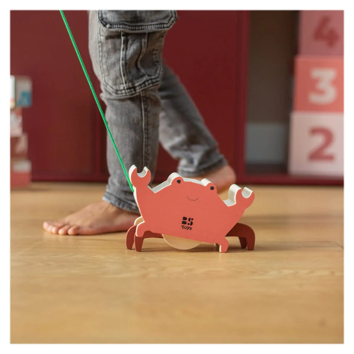 - Micutii se vor amuza sa vada cum, daca trag de snur, acest crab dragut isi misca piciorusele si clestii in timp ce merge dupa ei.