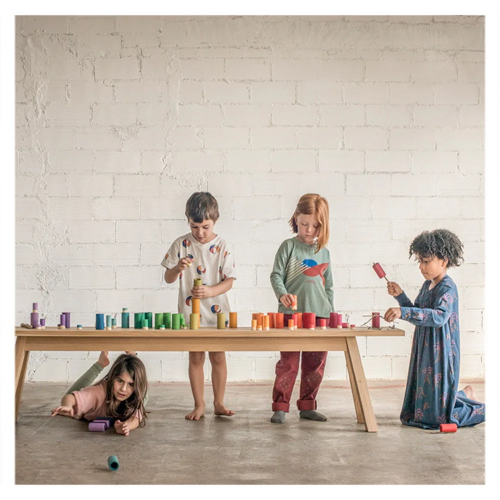- Acest set nou de la Grapat, de dimensiuni impresionante, contine 72 de piese din lemn pictate in 12 nuante diferite, inspirate de culorile curcubeului.