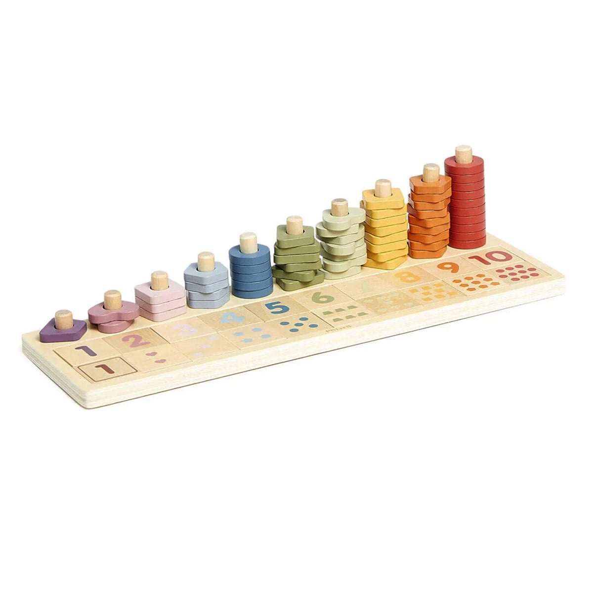 - Aceast joc de numarare si stivuire are o baza solida din lemn cu zece coloane, fiecare acoperita cu o serie de forme si discuri din lemn colorate.