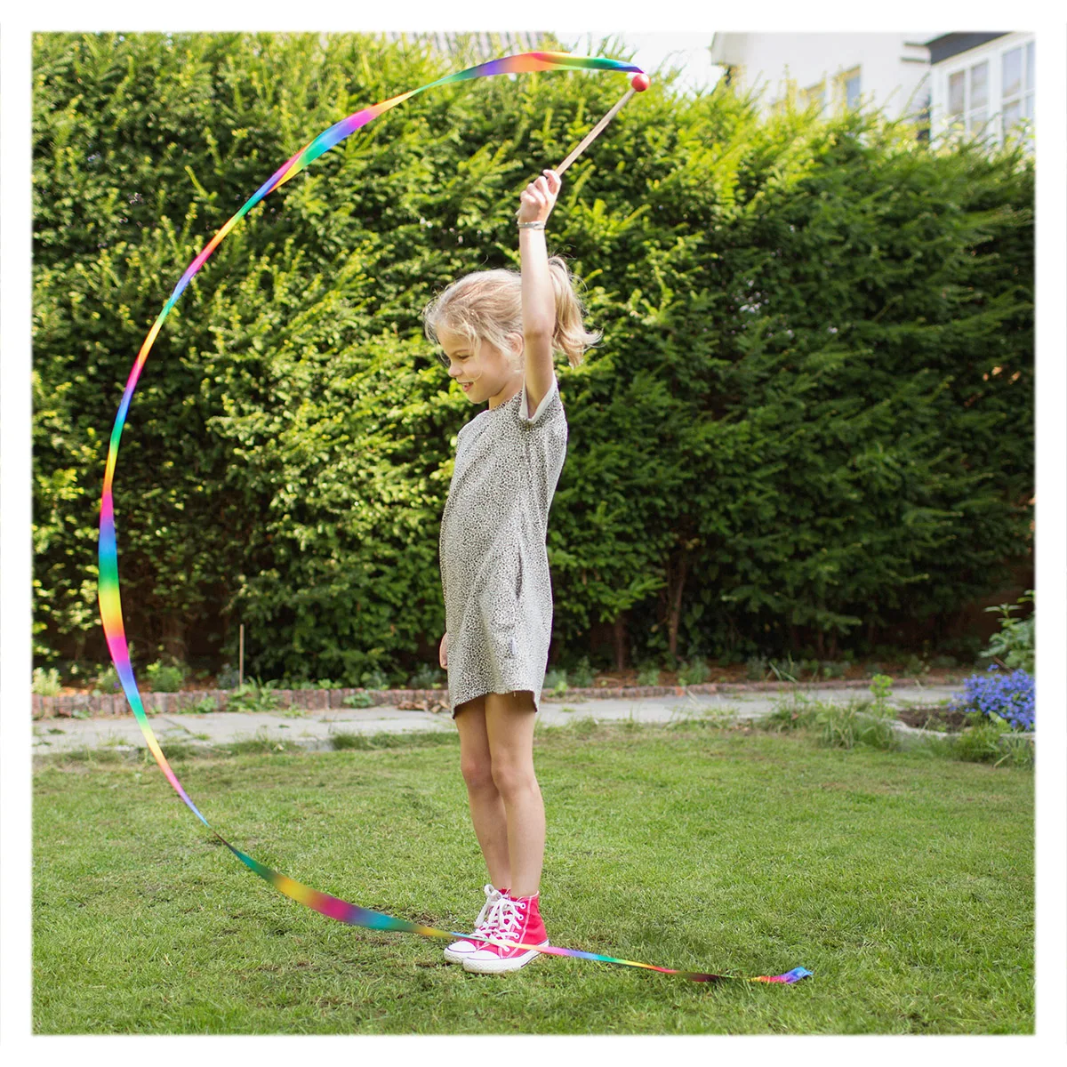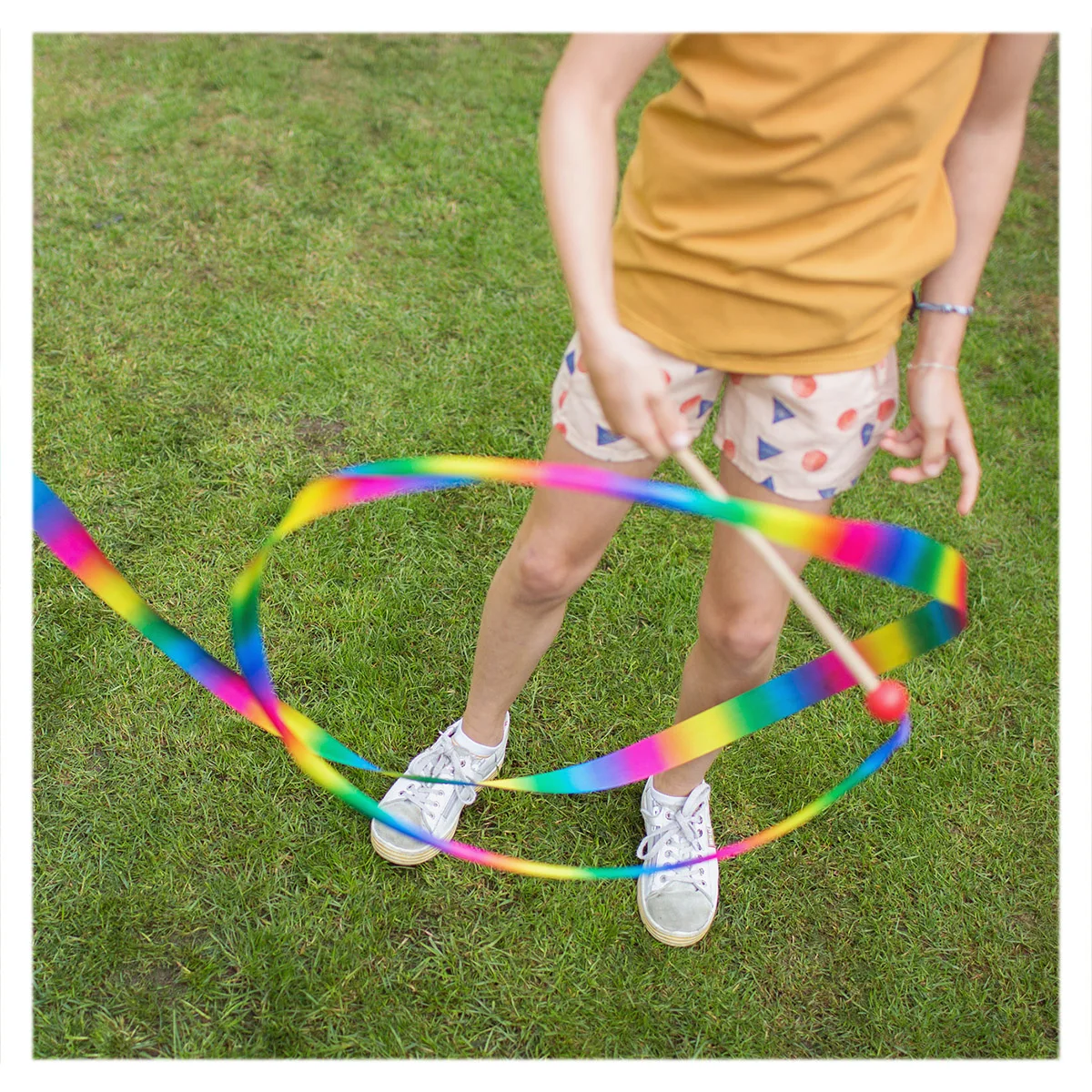 - Prinde betisorul de lemn, roteste panglica neteda in aer si observa cum aceasta iti urmareste cu gratie miscarile! Bucura-te de cele mai frumoase figuri artistice si fa-ti abilitatile de dans si mai spectaculoase cu acesta panglica de dans in culorile curcubeului!