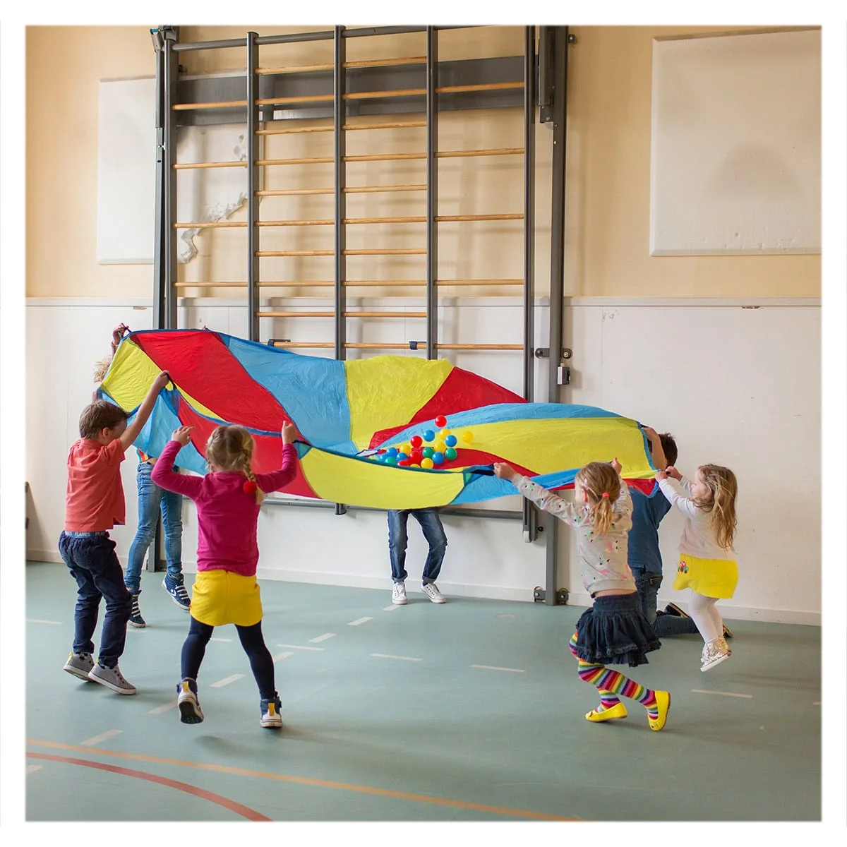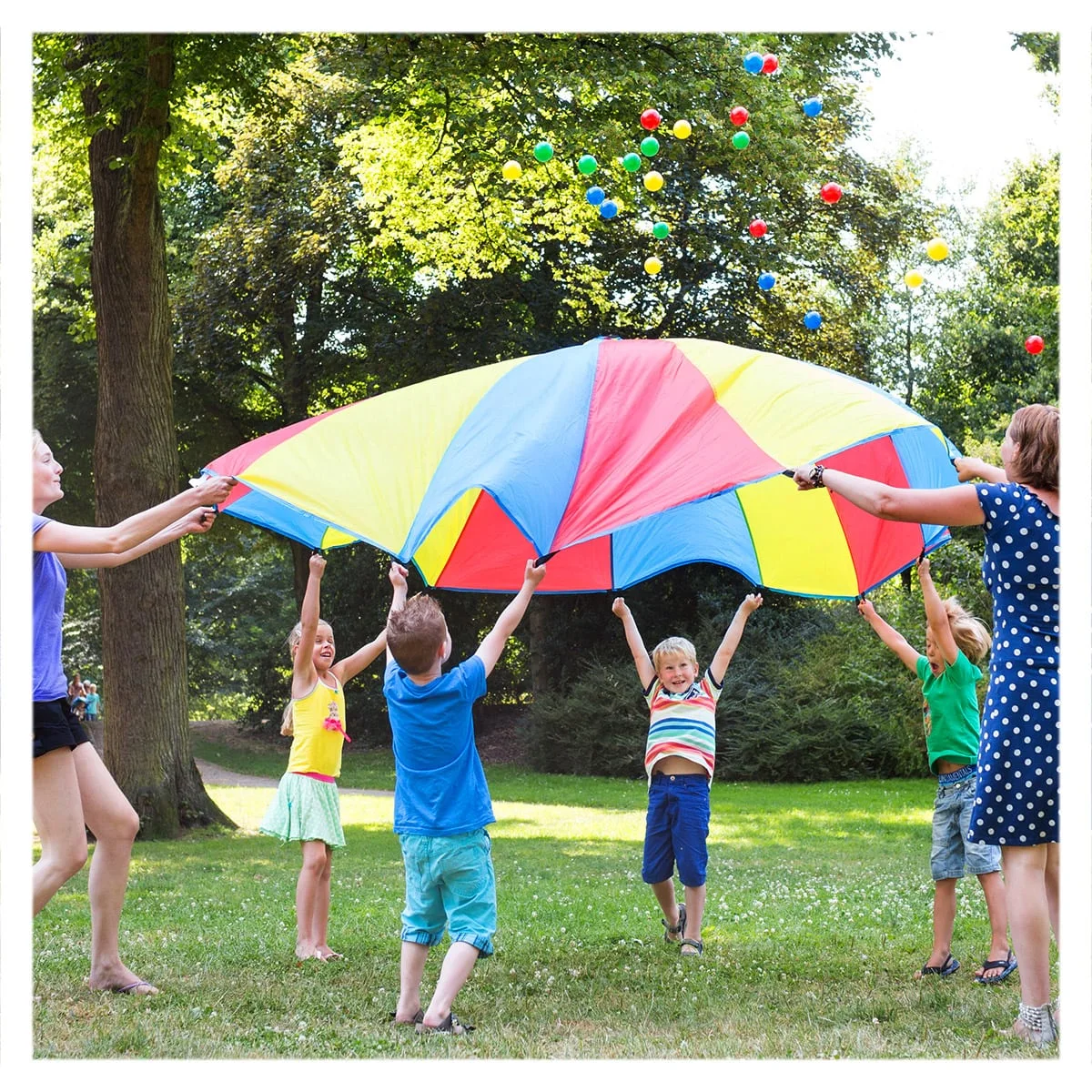- Setul include: o parasuta in trei culori cu diametru de 305 cm si 24 bile colorate (6 cm diametru).