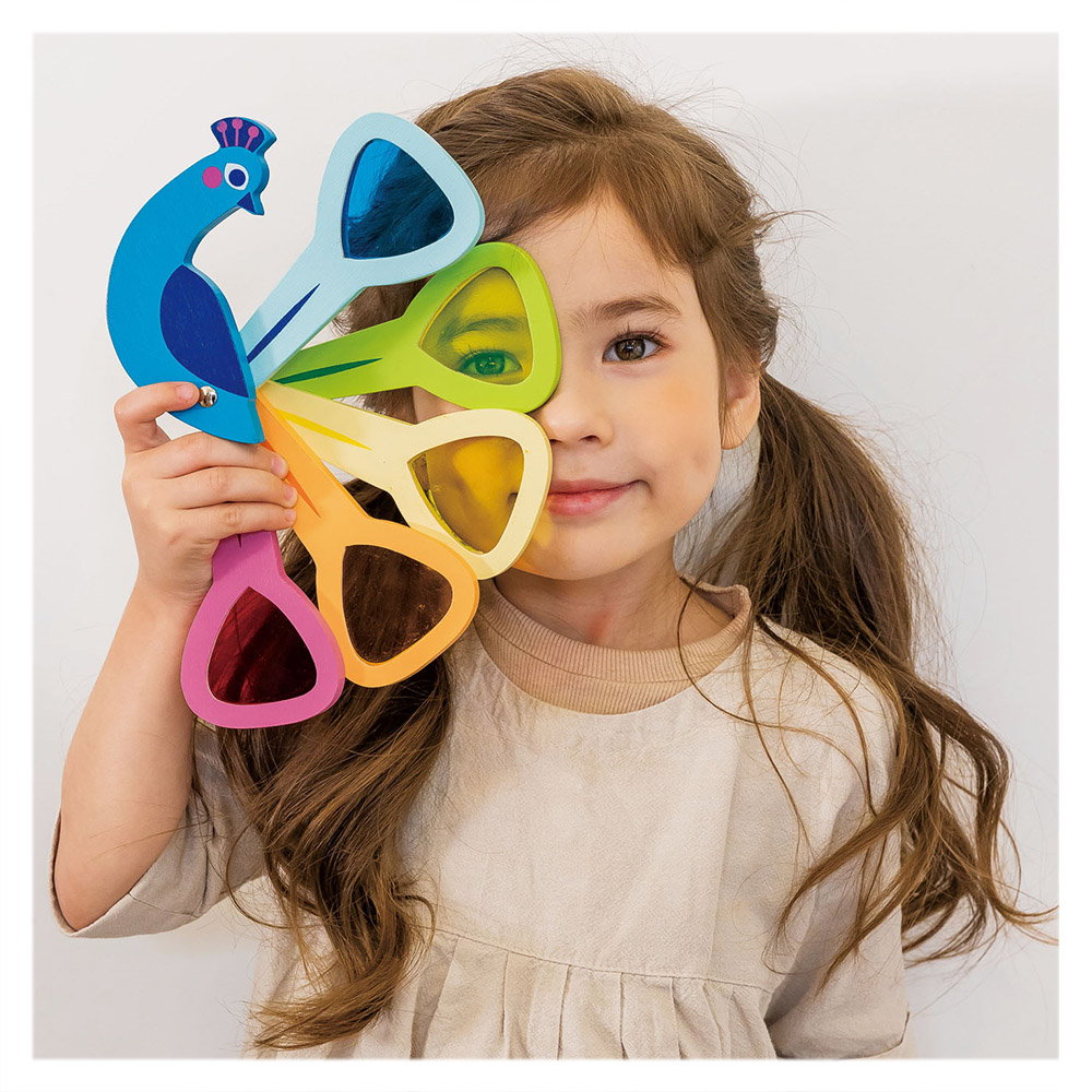 - Acest paun frumos colorat le ofera micutilor ocazia sa se distreze observand lumea din jur in culori diferite.