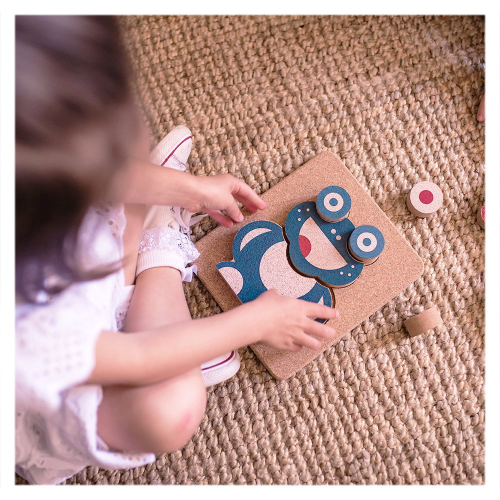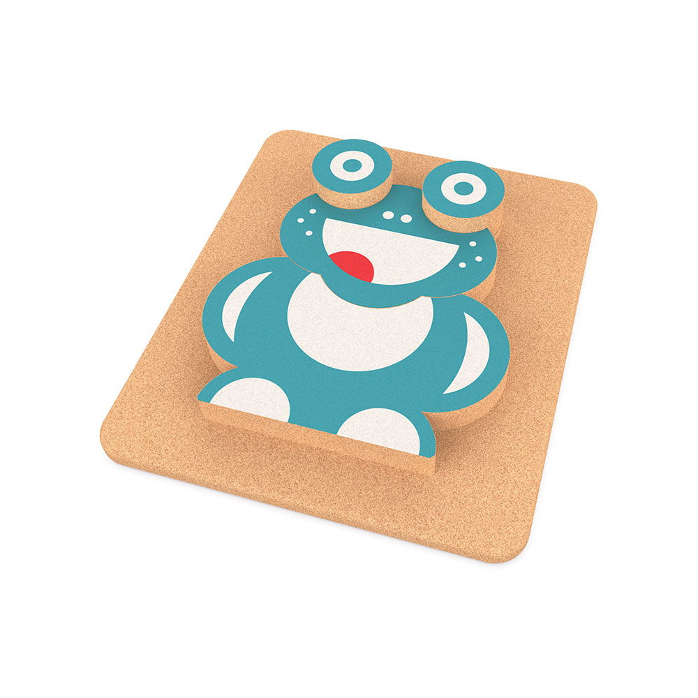 - Puzzle-ul 3D vine cu o placa din pluta naturala, pe care copiii vor potrivi cele cinci piese pentru a crea silueta unei broaste, familiarizandu-se cu anatomia acesteia si dezvoltandu-si perceptia proportionalitatii, constientizarea tridimensionala si rationamentul spatial.