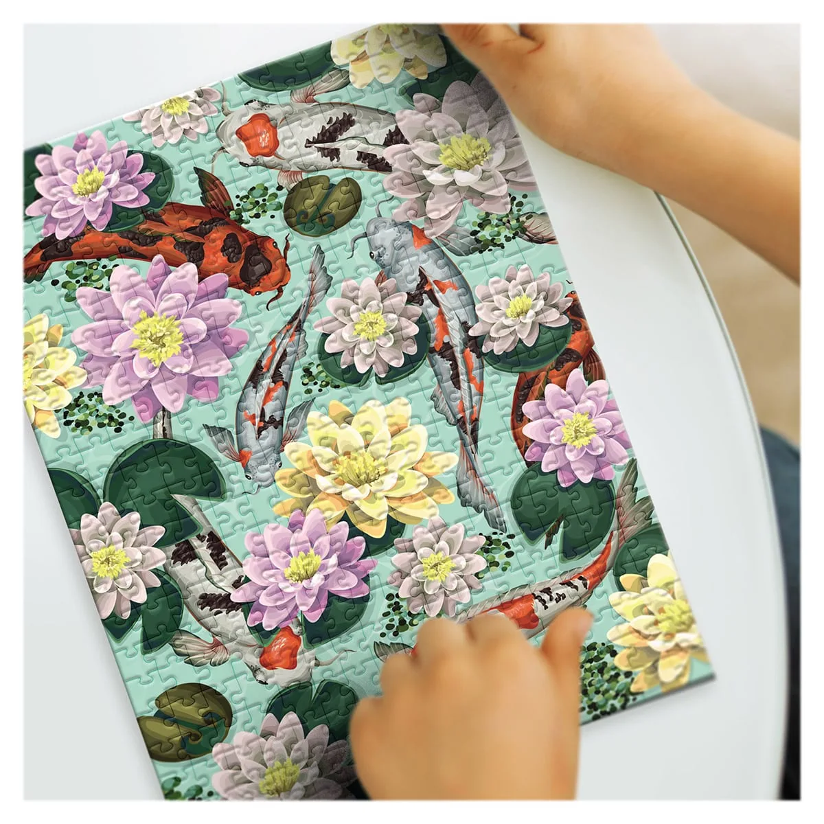 - Puzzle‑ul Dodo Toys Botany – Lotus Flowers este o mica opera de arta in format compact cu 350 de piese care, odata asamblate, ofera o imagine captivanta – un iaz cu flori bogate de lotus si pesti koi plutind seren printre ele.