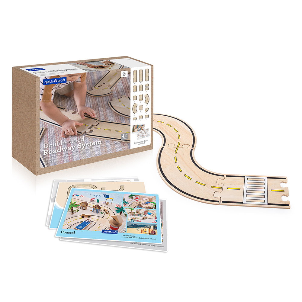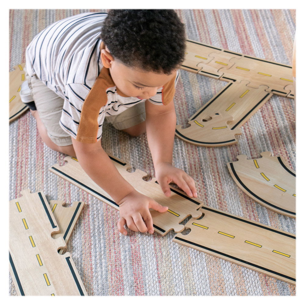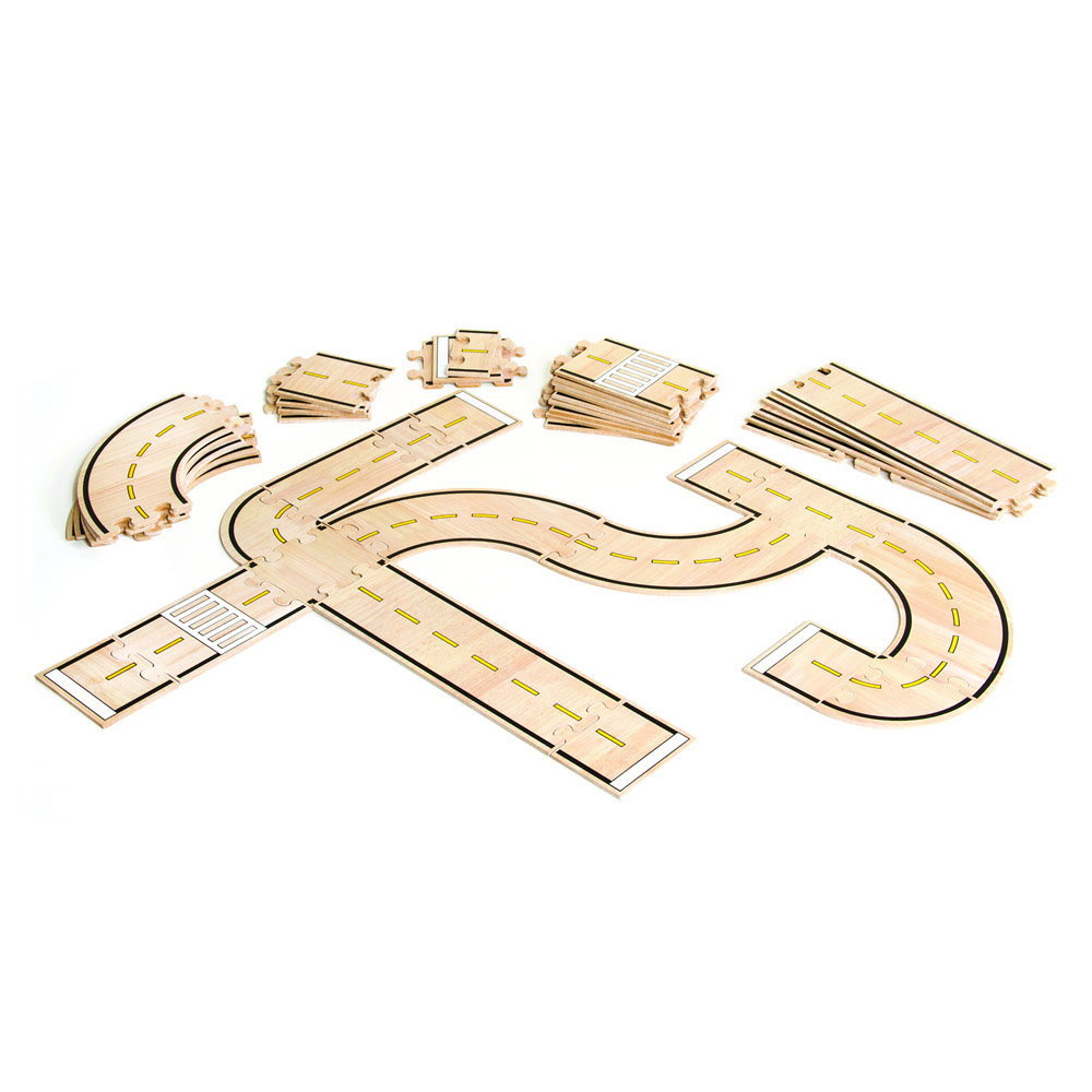 - Setul Roadway System contine 42 de segmente de drum de tip puzzle de dimensiuni si forme diferite, cu care copiii pot realiza nenumarate configuratii de trasee auto pentru masinutele si blocurile din lemn preferate.