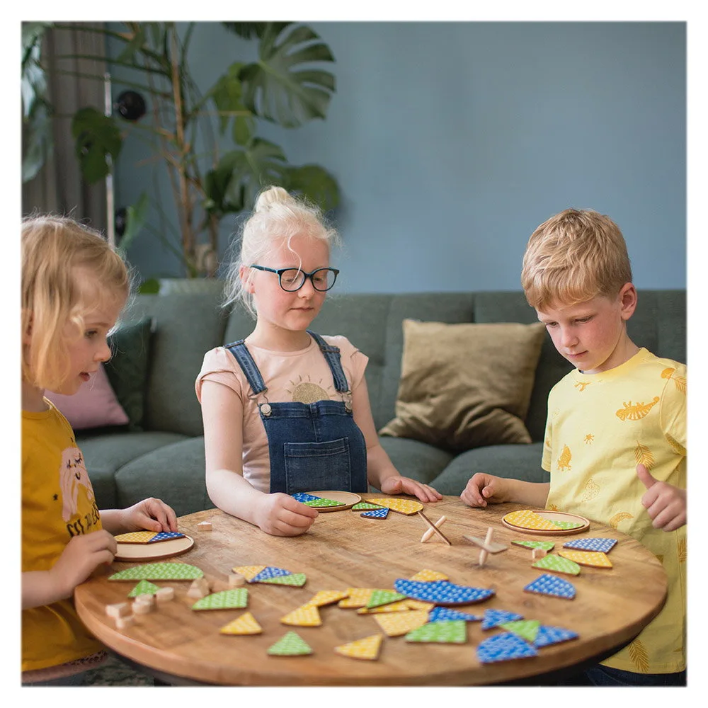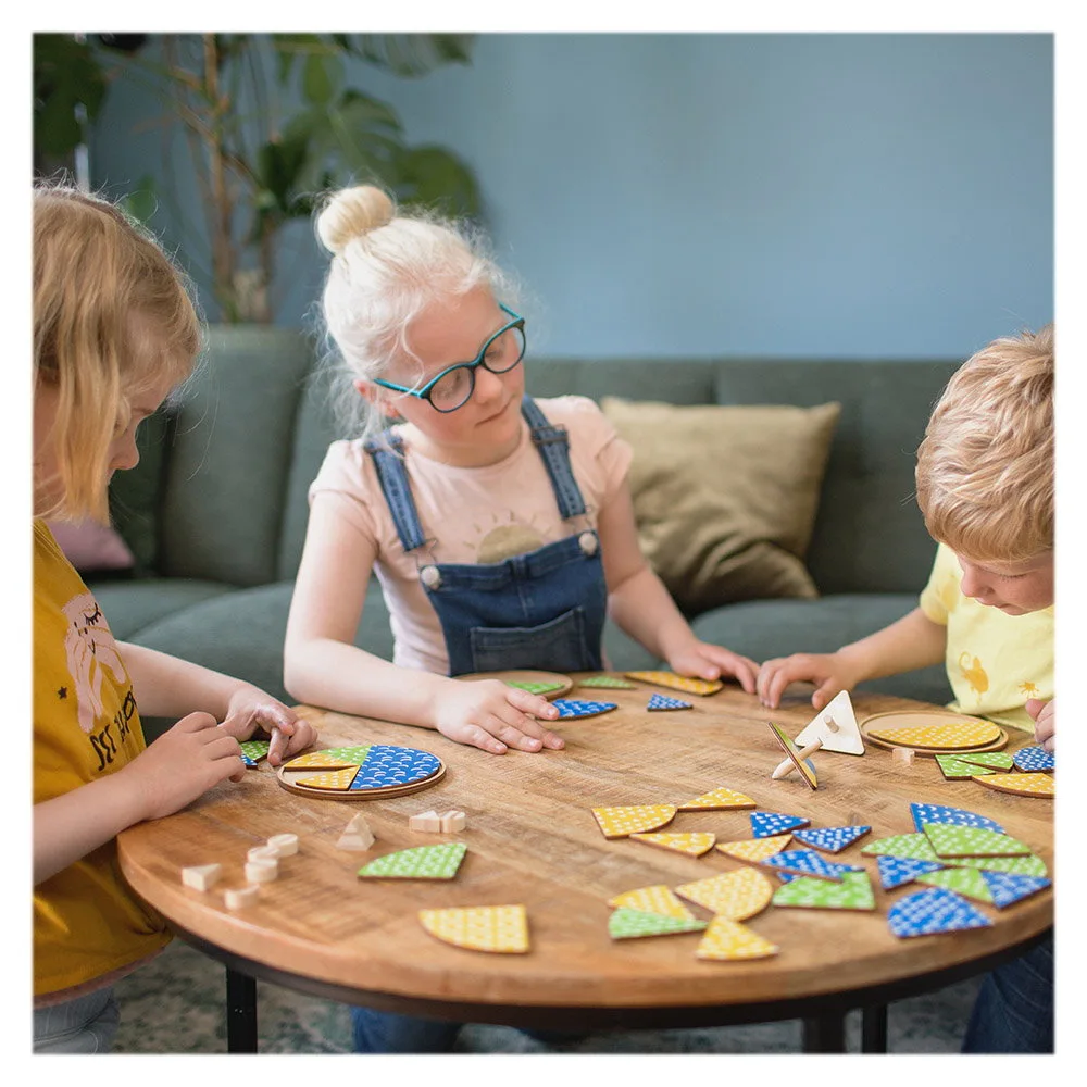 - Alegeti cine incepe jocul. Primul jucator va invarti ambii titirezi. Cand titirezii se opresc, utilizeaza forma si culoarea din partea de sus a acestora. Ai o piesa cu aceasta forma sau culoare? Daca da, aseaz-o pe tabla ta de joc si incerca sa completezi cercul. Daca poti plasa o piesa, asigura-te ca vei lua o alta bucata, la alegere, dintre cele din mijlocul mesei. Trebuie sa ai intotdeauna 3 piese in fata ta, fara a le include pe cele de pe tabla de joc.