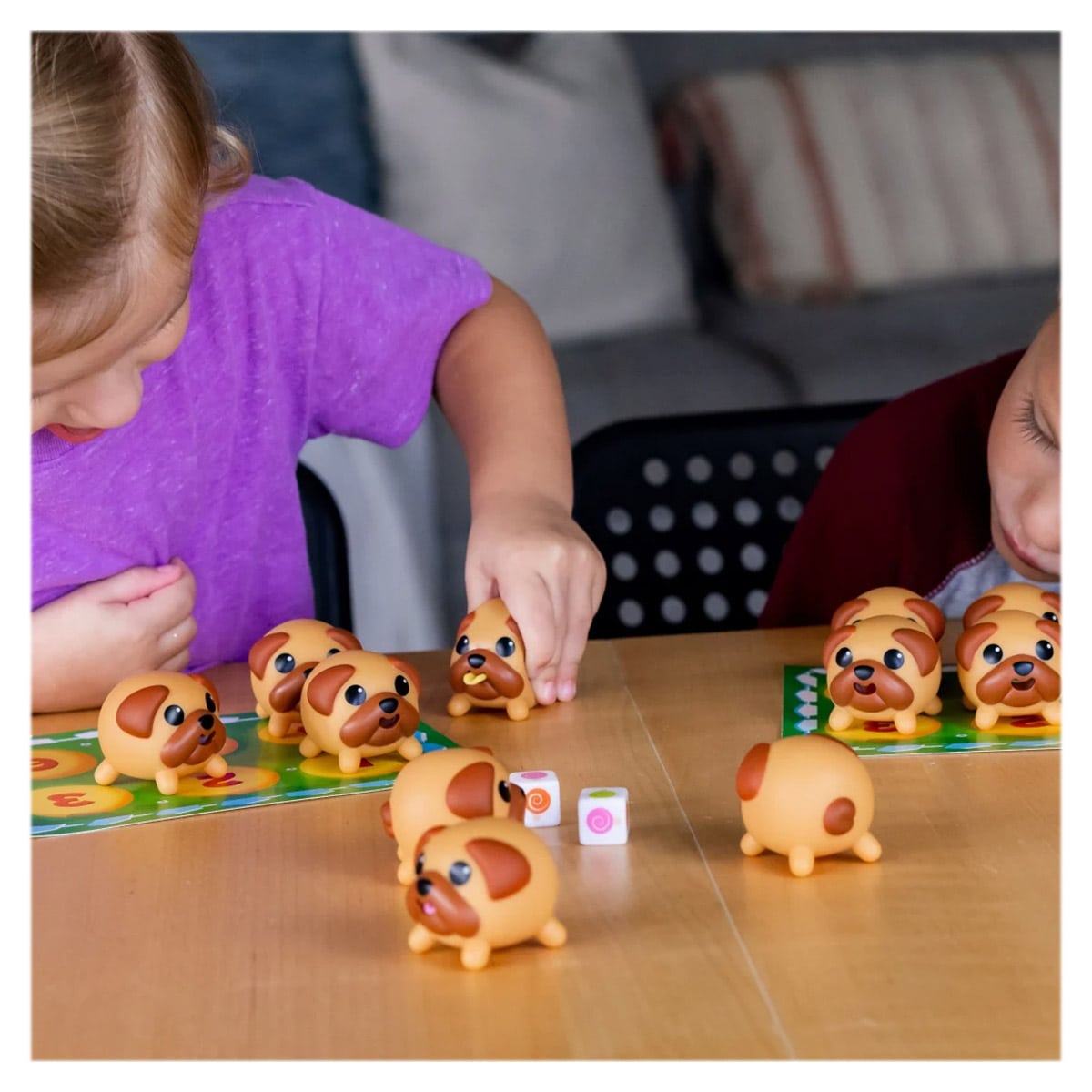 - Trebuie doar sa strangeti usor catelusii pentru a observa culoarea limbii fiecaruia si sa-i potriviti la locul corespunzator de pe placuta voastra, in functie de culorile acadelelor de pe zarurile pe care le veti arunca cand va va veni randul.
