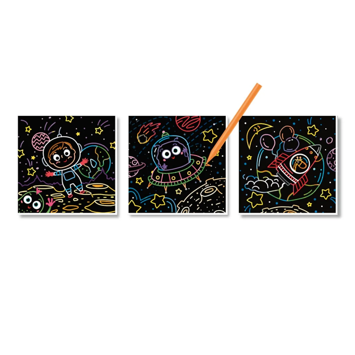 - Incurajeaza creativitatea micutului tau cu acest set de gravura razuibil avand ca tematica Spatiul Cosmic, de la Dodo Toys!
