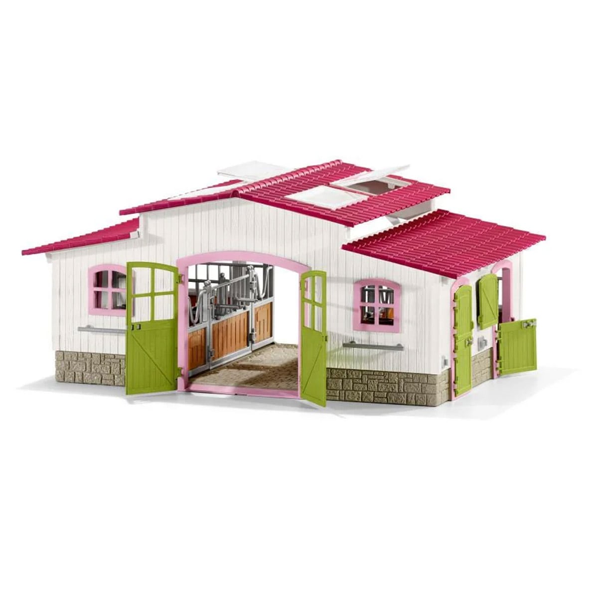 • Grajdul este proiectat cu functii practice: acoperis detasabil care permite acces facil, usi care se deschid, si porti pentru paddock-uri ce pot fi conectate in diferite configuratii.