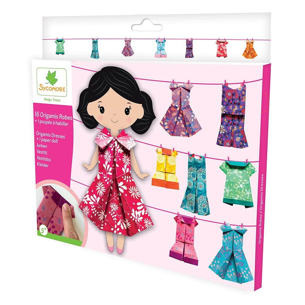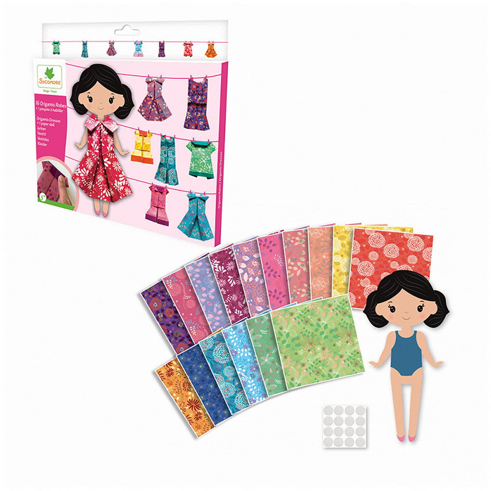 - Setul de rochite origami Sycomore le ofera copiilor posibilitatea de plia cele 16 foi de hartie cu modele, prin tehnica origami, pentru a realiza patru modele frumoase de rochite, urmand instructiunile ilustrate cuprinse in brosura.