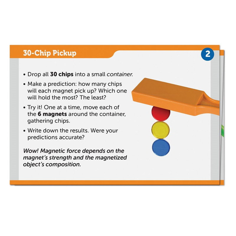 - Setul include: bagheta magnetica, pilon, 2 inele magnetice, magnet in forma de bara, 2 bilute magnetice, magnet in forma de potcoava, snur, 30 jetoane colorate, ghid de activitati in limba engleza.