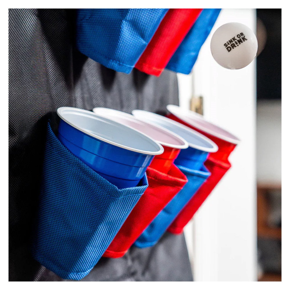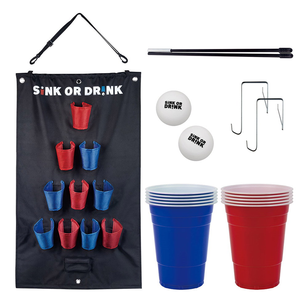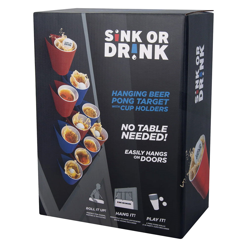 - Sink or Drink este o un joc de beer-pong suspendabil, care poate fi agatat cu usurinta de usa si care are suporturi pentru pahare cu coduri de culori pentru echipe.
