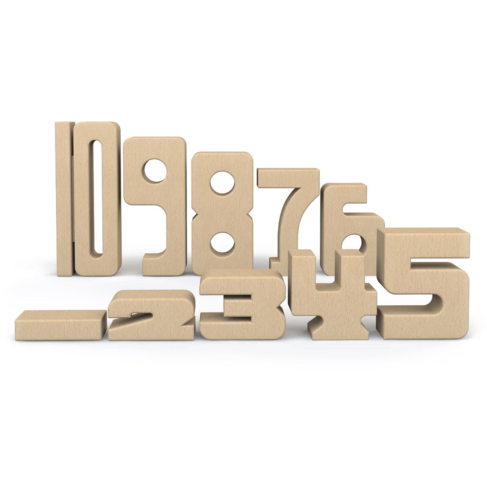 - Blocurile solide inovative au forma unor numere de la 1 la 10, cu fiecare piesa avand dimensiuni proportionale cu valoarea sa numerica. Este simpla matematica vizuala. De exemplu, daca se stivuiesc impreuna cele doua blocuri care reprezinta cifra 9 si 1, acestea au aceasi inaltime ca numarul 10.