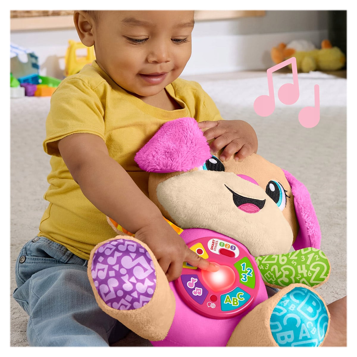- A Fisher-Price Tanuló kutyushugi rózsaszín fülű, masnival díszített édes plüsskutya, aki azonnal a babák kedvence lesz!