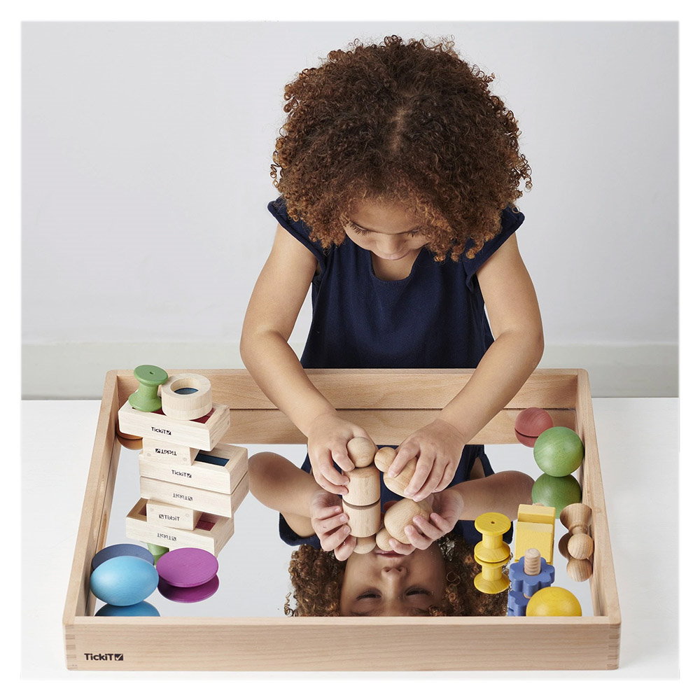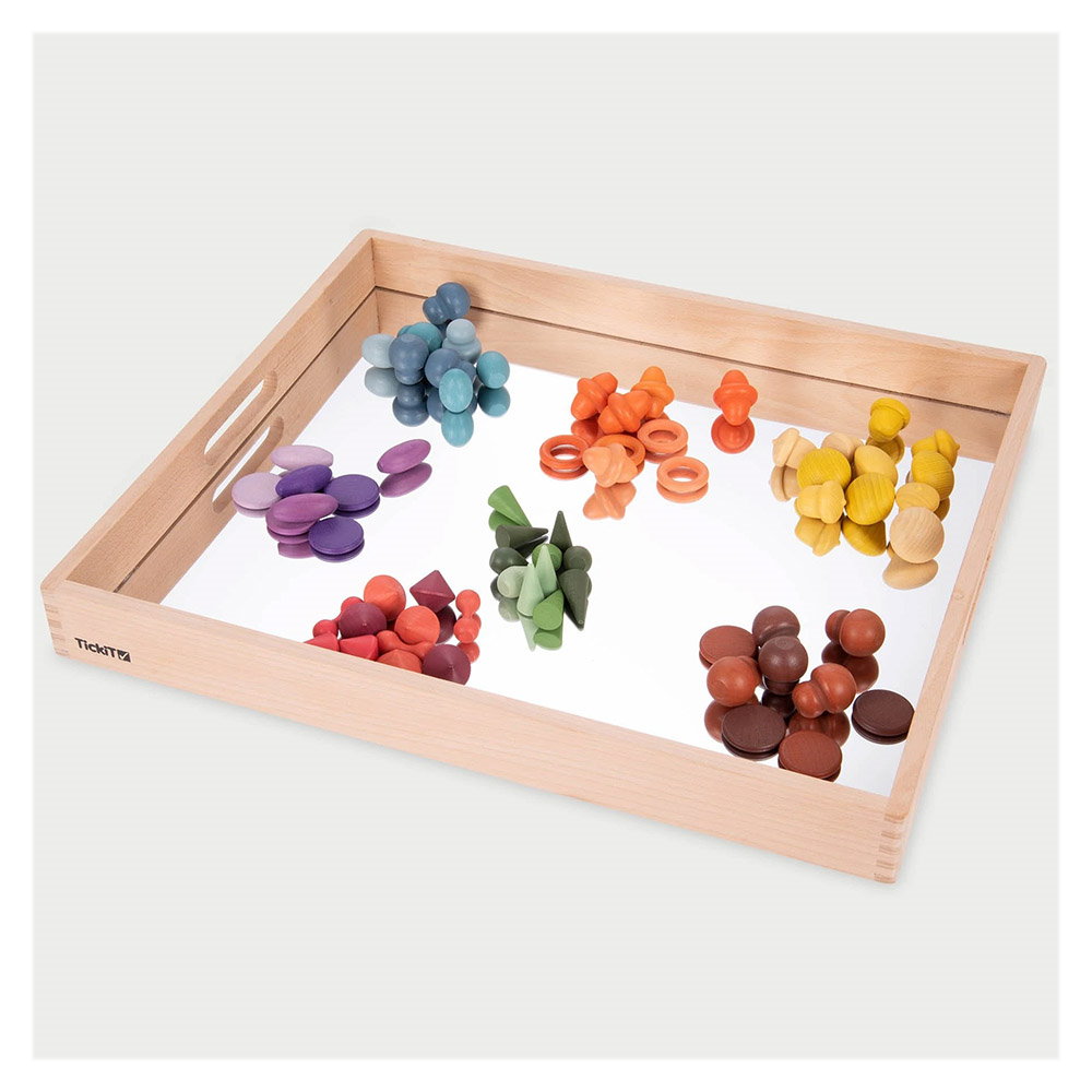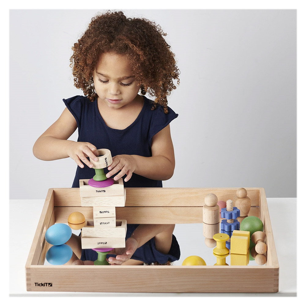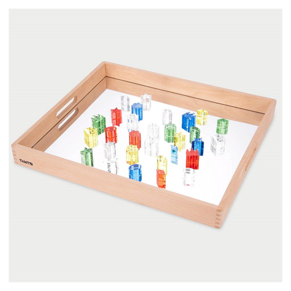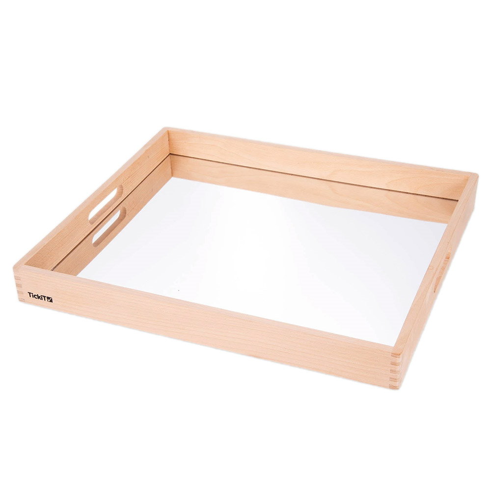 - Tava din lemn cu oglinda acrilica de la TickiT este ideala pentru a observa si inspecta indeaproape obiecte interesante din mediul inconjurator, ca mic mediu de joaca unde se pot experimenta noi perspective asupra lumii sau pentru a fi folosita in jocul imaginativ ca un cadru pentru a crea scene fascinante si lumi in miniatura.