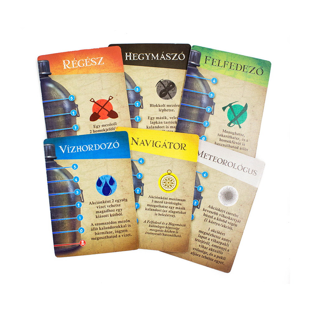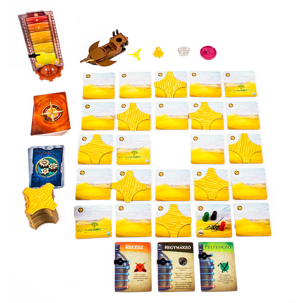 - A játék tartalma: 49 kártya; 48 homokjelölő; 24 sivatag-/városlapka; 6 bábu (kalandorok); 6 jelölő kapocs; 4 Éghajó alkatrész; 1 repülő modell; 1 viharerősség-jelző; 1 talp a viharerősség-jelzőhöz; szabályfüzet