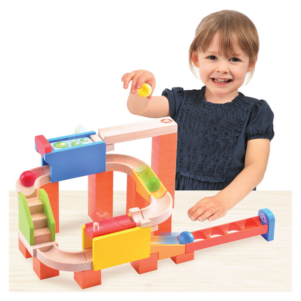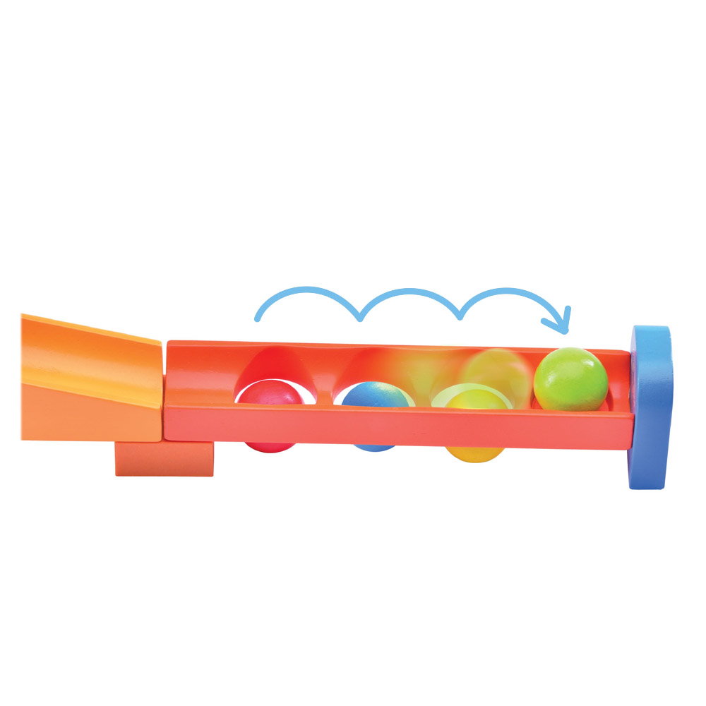 - Asamblati piesele din lemn pentru a crea o pista rezistenta prevazuta cu trucuri speciale de-a lungul ei, cum ar fi un flipper cu ajutorul caruia bila poate cobori in stanga ori in dreapta, o scarita, tuneluri. Dupa asamblare, copiii vor putea pune mingile in partea de sus a pistei si vor urmari traseul parcurs de catre acestea pana la linia de sosire.