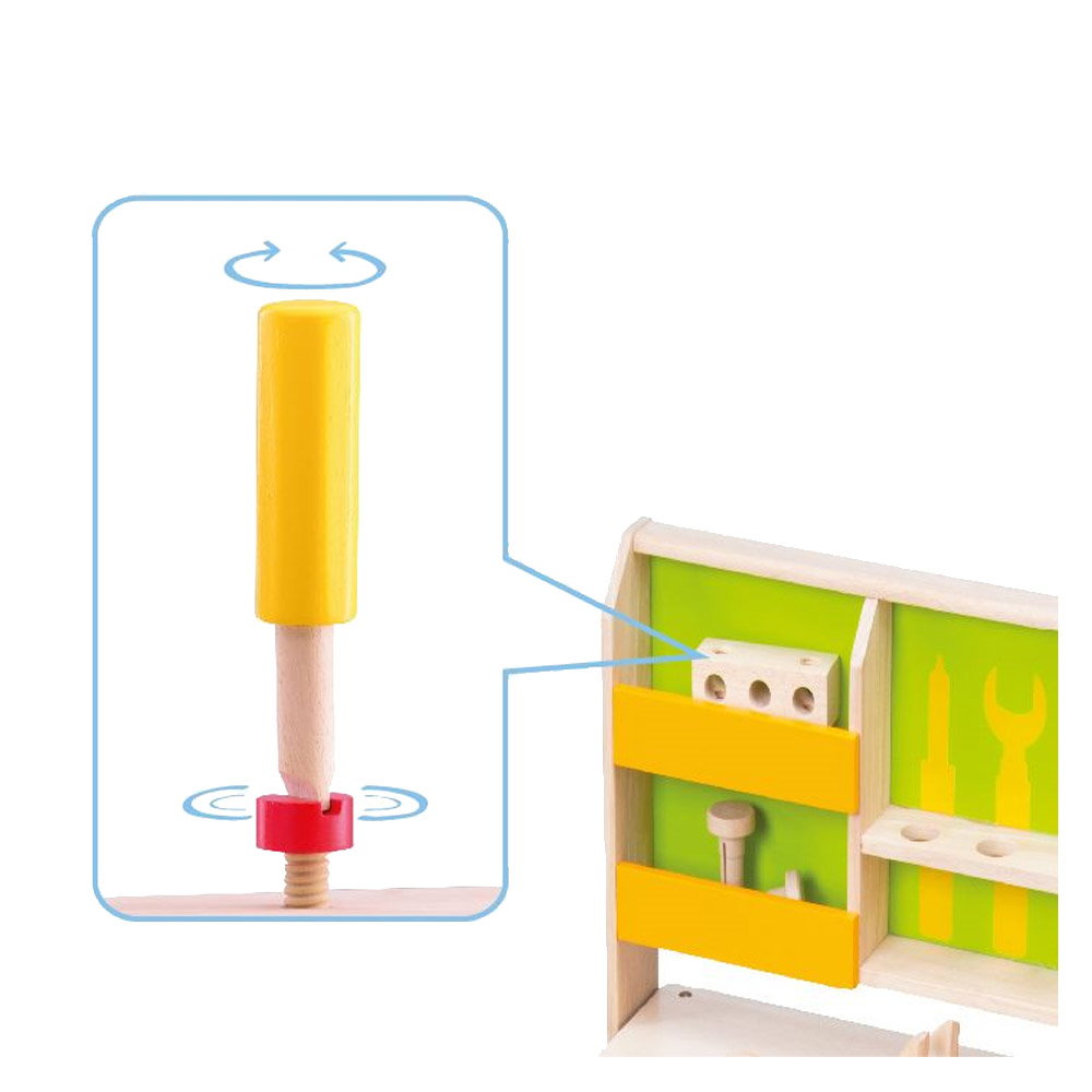 - Cu acest banc de lucru din lemn, micii tamplari vor petrece ore intregi de joc de rol, prefacandu-se ca repara si mesteresc, distrandu-se si dezvoltandu-si abilitatile prin joaca.