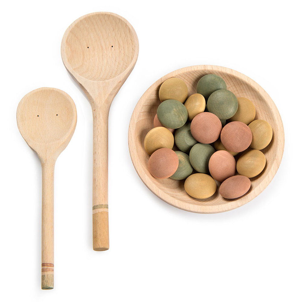 - Un frumos set de joaca, realizat din lemn masiv de inalta calitate, format dintr-o farfurie, doua linguri de marimi diferite si 24 de bucati rotunde de mancare delicioasa.