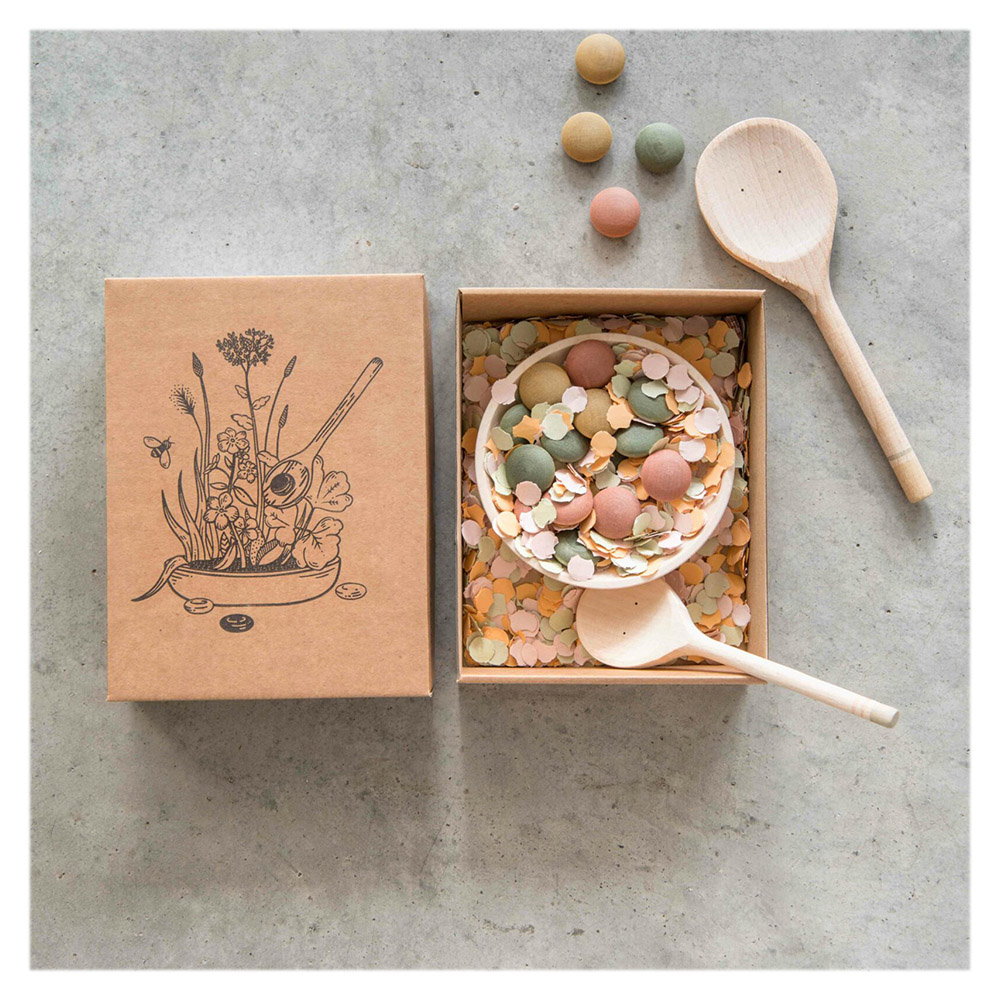 - Cu Yummy, Grapat copiii se vor bucura sa manuiasca cele doua linguri diferite de lemn pentru a-si servi prietenii si familia cu delicioasele bucati rotunde de „mancare”, in nunate pastel-natural de roz, verde si galben, pe farfuria de lemn inclusa.